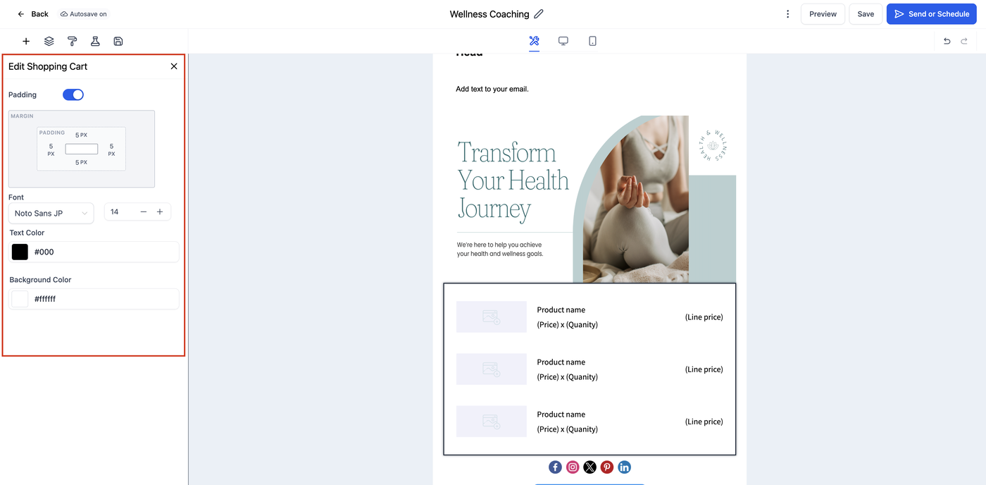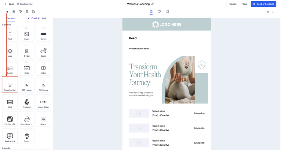 Das Shopping Cart Element ist ein Drag-and-Drop-Baustein, der Produktdetails und Checkout-Links direkt in E-Mails einfügt. Typische Anwendungsfälle: