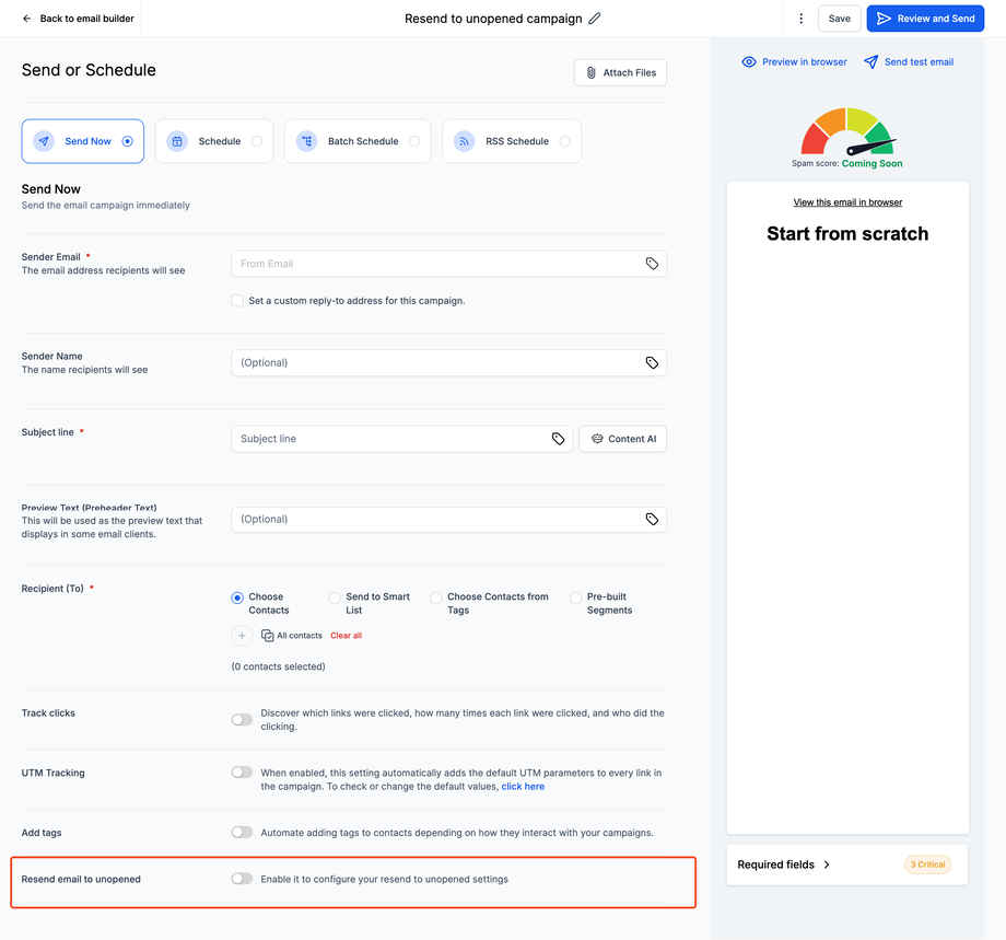 Diese Funktion verbessert die Verwaltung von E-Mail-Wiederholungen an Kontakte, die die ursprüngliche E-Mail nicht geöffnet haben. Sie können Wiederholungsoptionen bereits während der Kampagnenerstellung vorkonfigurieren und diese direkt in der Kampagnenliste überwachen oder anpassen.