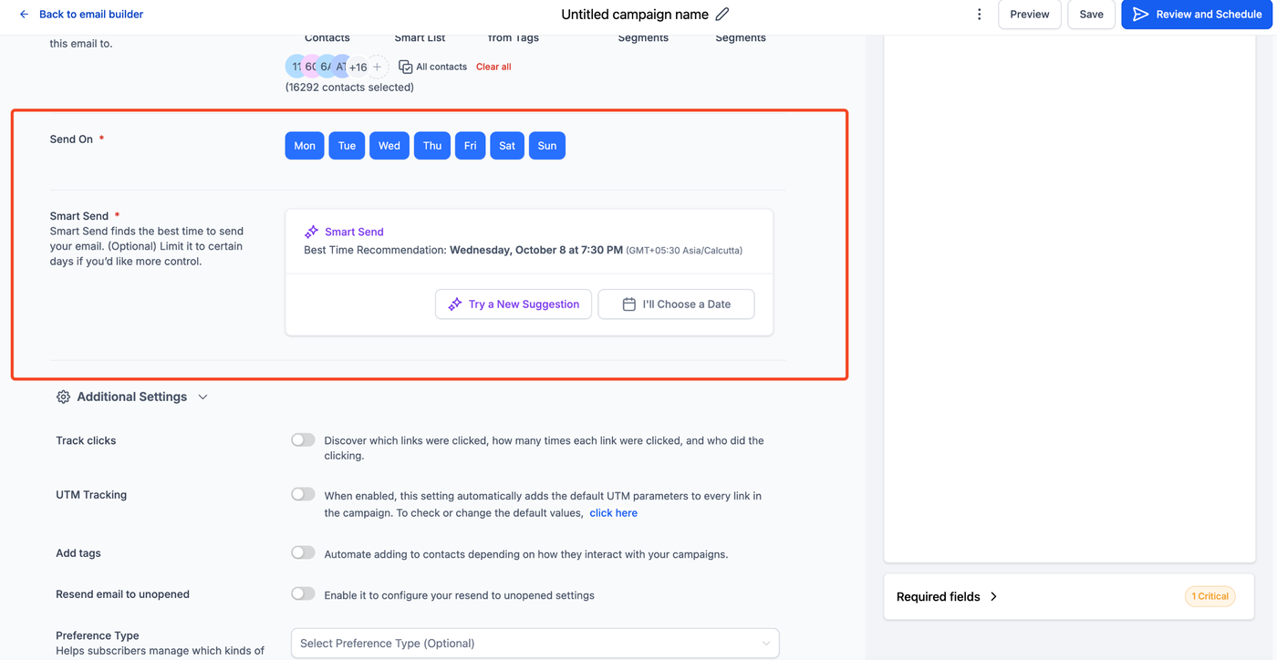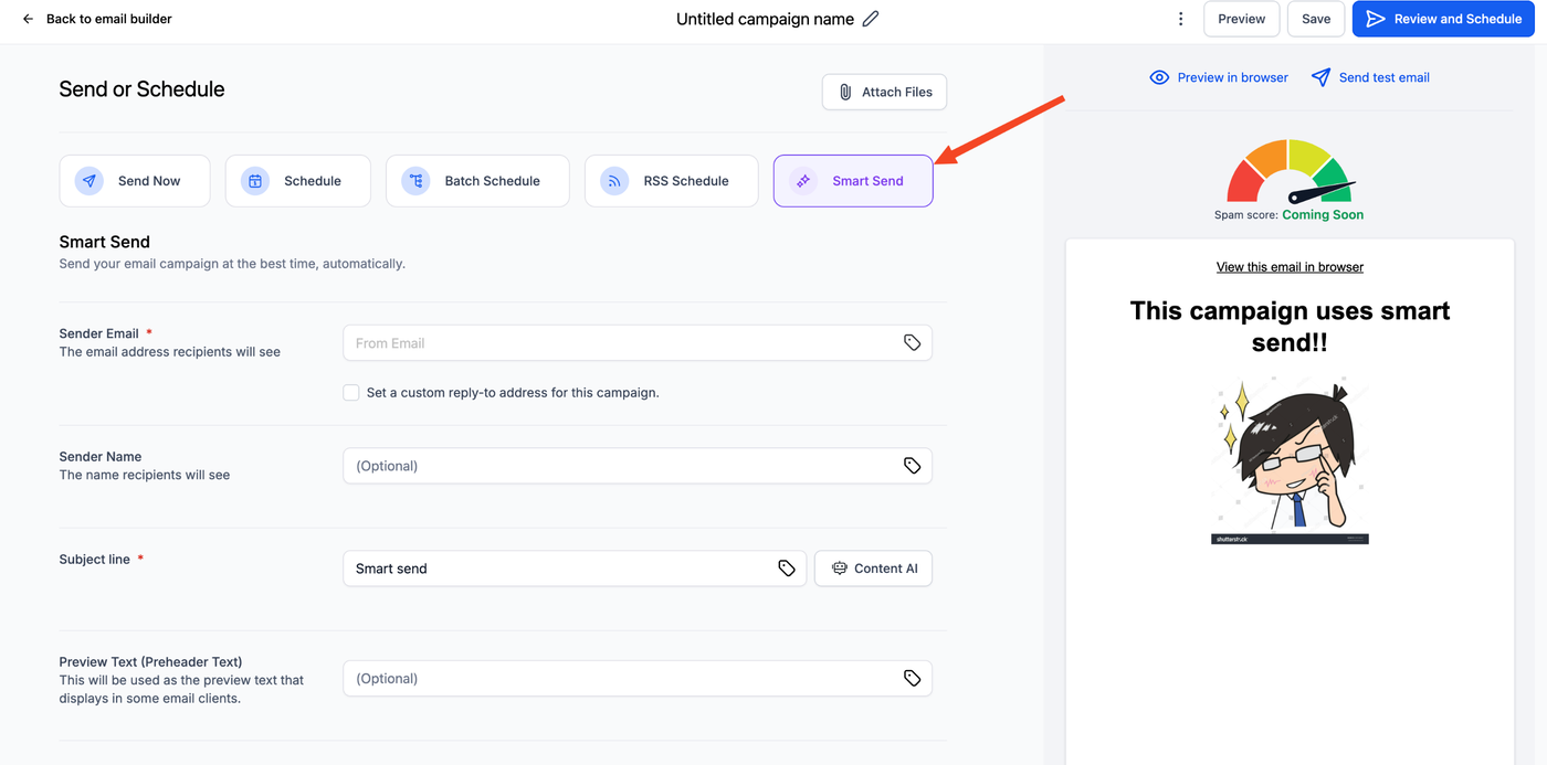 Smart Send nimmt Ihnen das Rätselraten ab, „Wann soll ich auf Senden klicken?“, indem automatisch der optimale Versandzeitpunkt für jede reguläre E-Mail-Kampagne empfohlen wird. Das Ergebnis sind höhere Öffnungs- und Klickraten ohne zusätzlichen Einrichtungsaufwand – ideal für vielbeschäftigte Marketer, die datenbasierte Ergebnisse erzielen möchten.