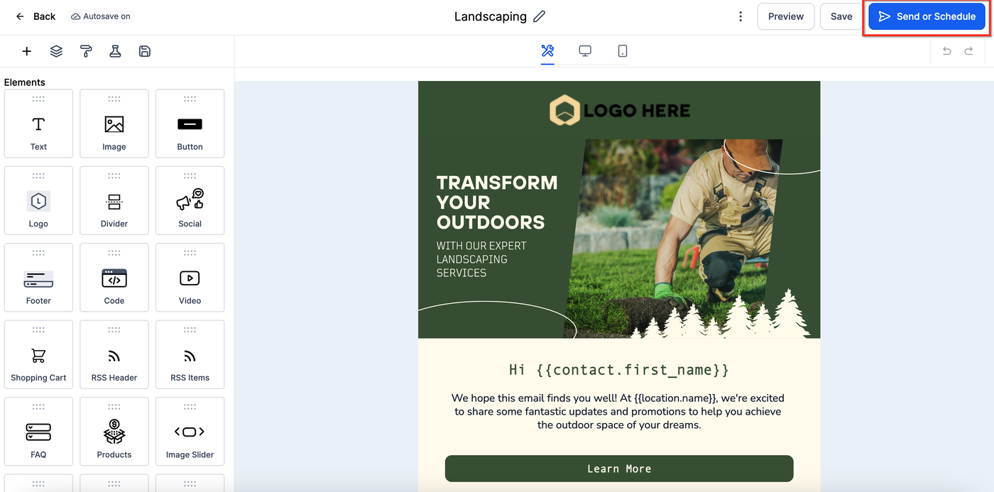 Gestalten Sie Ihre E-Mail und klicken Sie anschließend auf Senden oder Planen.