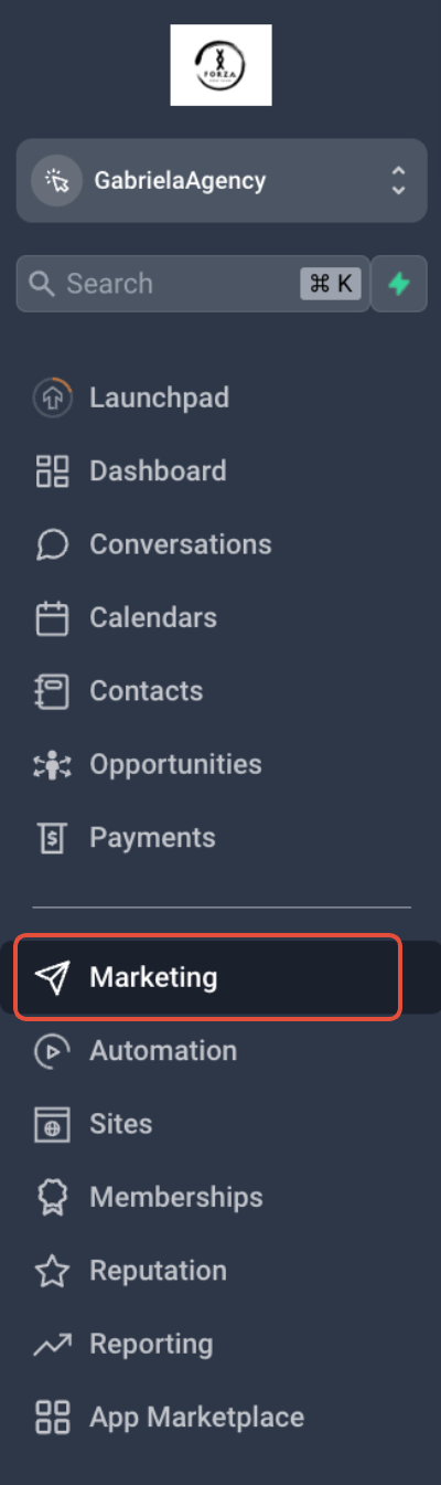 Gehe in deinem Subaccount auf Marketing.