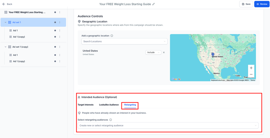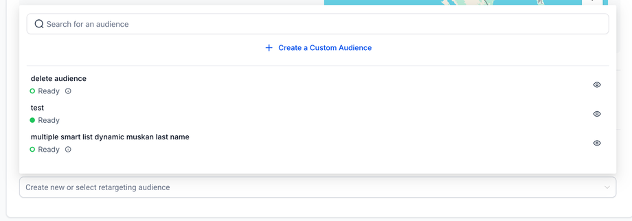 Sobald die Zielgruppe erstellt und bereit ist, erscheint sie im Dropdown-Menü Retargeting Audience sowie im Audiences-Tab.