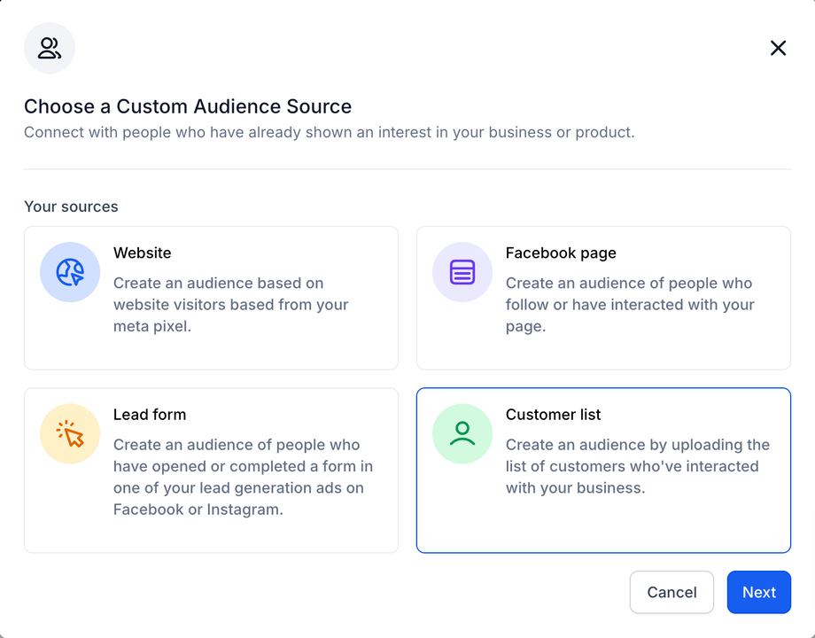 Eine Meta Customer List Custom Audience ermöglicht es Ihnen, eigene Kundendaten (E-Mail-Adressen, Telefonnummern usw.) im Ad Manager zu verwenden, um bestimmte Personen auf Facebook und Instagram gezielt anzusprechen.