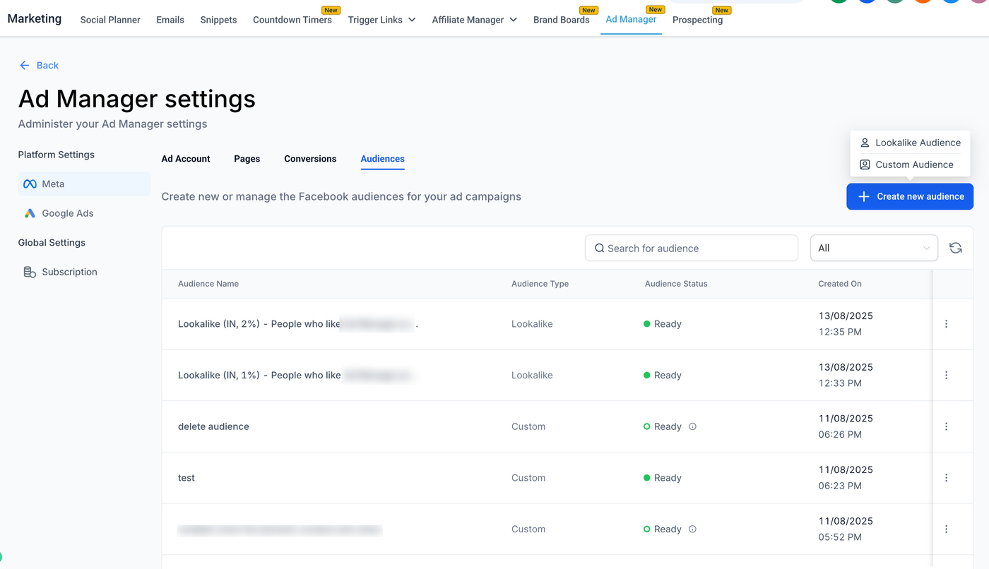 Navigieren Sie zu Ad Manager Einstellungen → Meta Audiences, um Zielgruppen im Voraus für zukünftige Kampagnen zu erstellen.