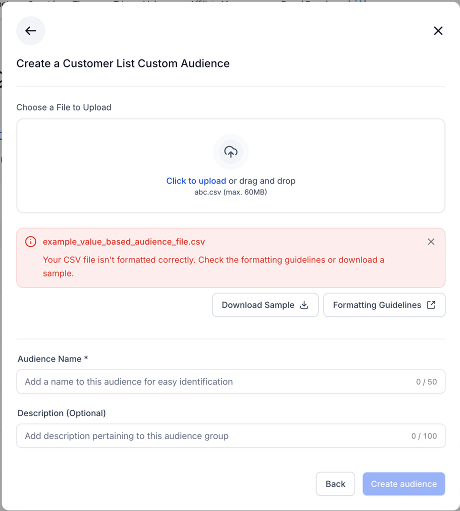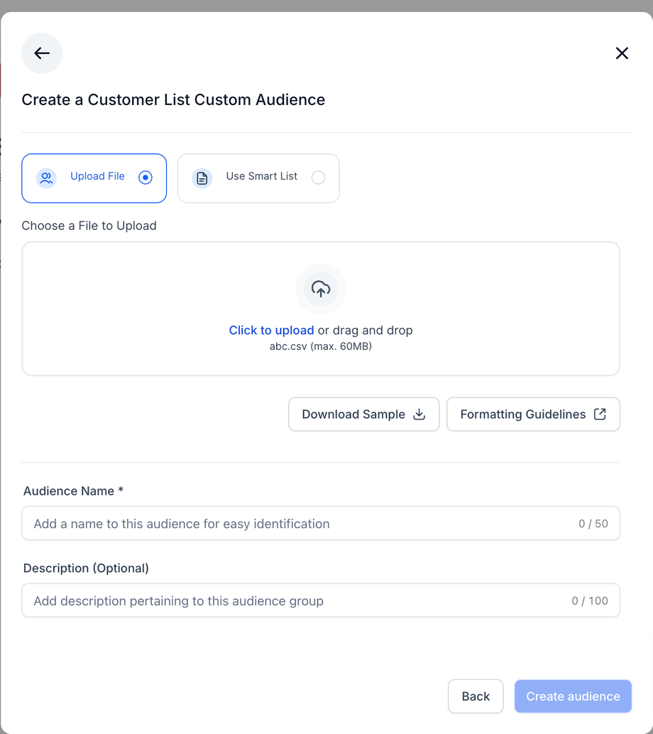 Klicken Sie auf Create a Custom Audience (entweder im Kampagnen-Flow oder im Audiences-Tab).