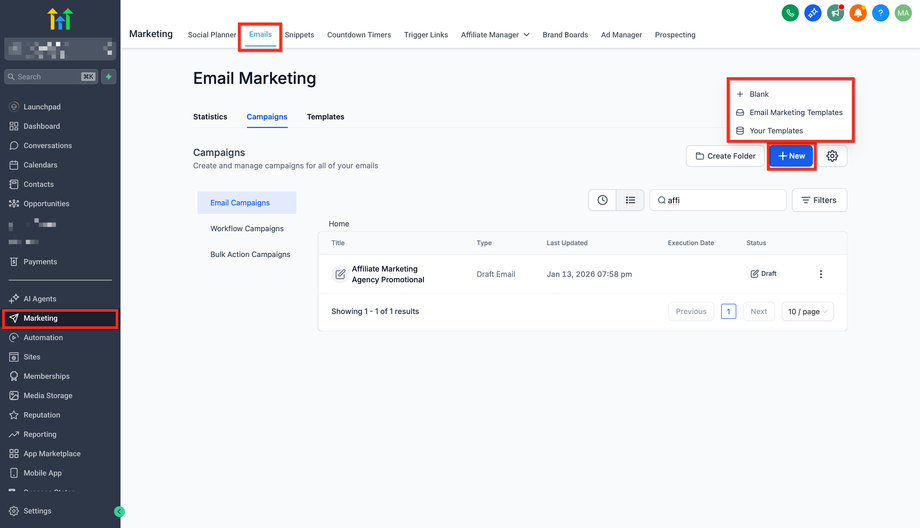 Navigiere zu: Marketing → E-Mails → Kampagnen