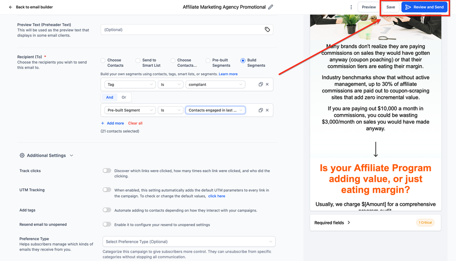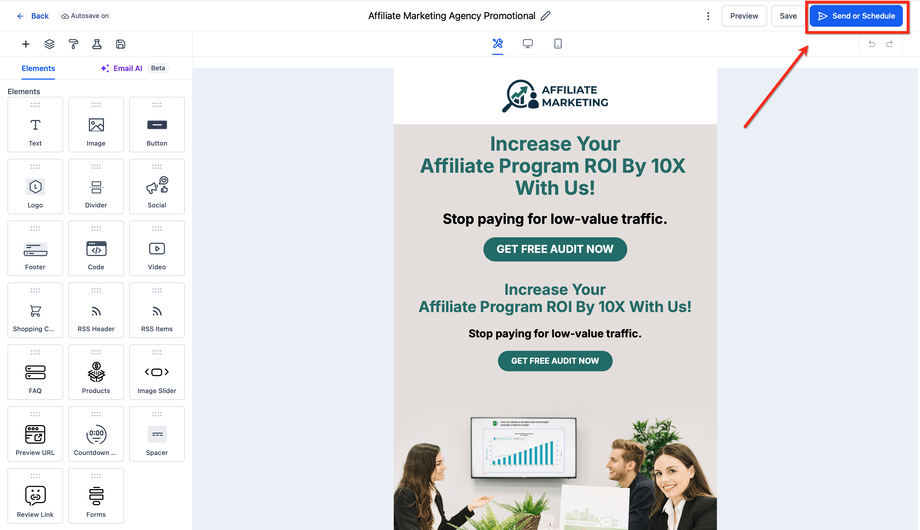 Klicke auf „Senden oder Planen“ oben rechts im E-Mail-Builder.