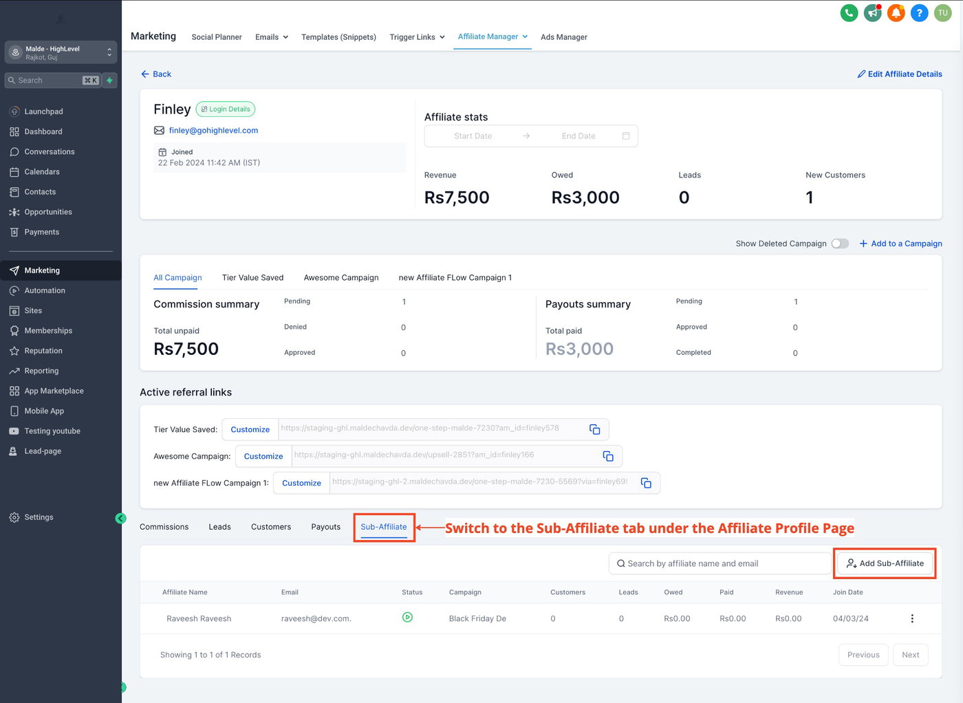Zum Sub-Affiliate-Tab wechseln: Scrollen Sie zum Tab „Sub-Affiliate“.