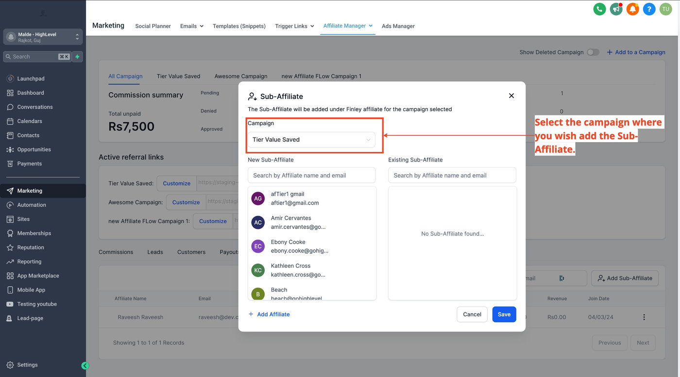 Sub-Affiliates auswählen: Wählen Sie die Affiliates aus, die Sie hinzufügen möchten.