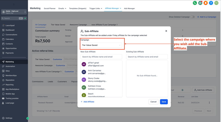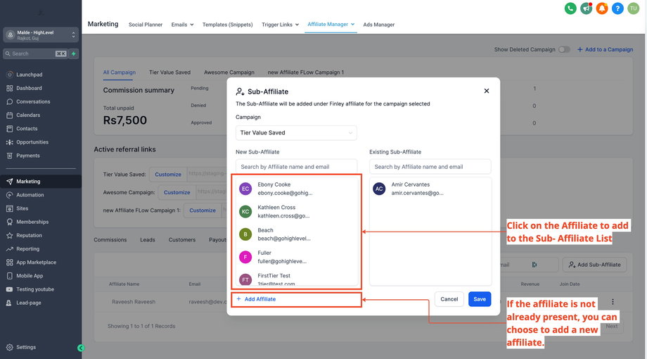 Wählen Sie einen Affiliate aus: Klicken Sie auf den Affiliate, unter dem Sie Sub-Affiliates hinzufügen möchten.