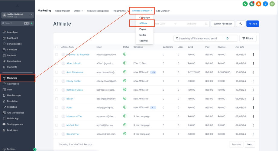 Gehen Sie zum Sub-Account Affiliate Manager.