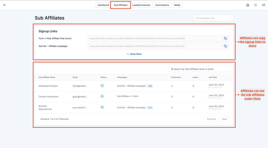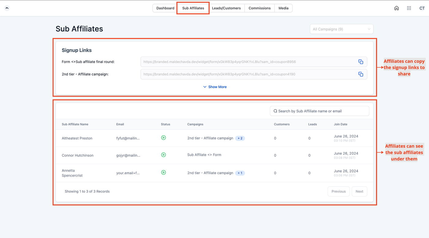 Affiliates können selbst Sub-Affiliates rekrutieren, indem sie einen Anmelde-Link teilen. Dieser Prozess erleichtert das Onboarding und gibt Affiliates mehr Autonomie.