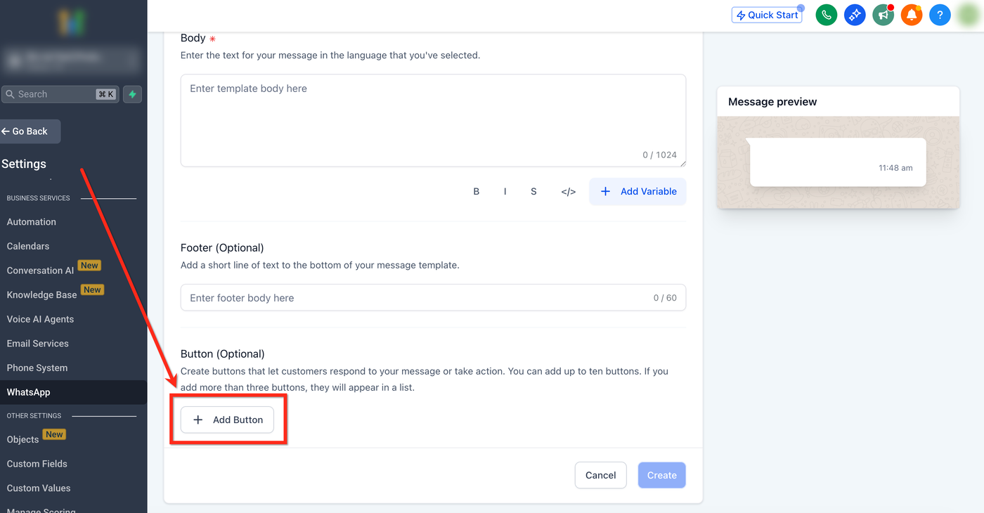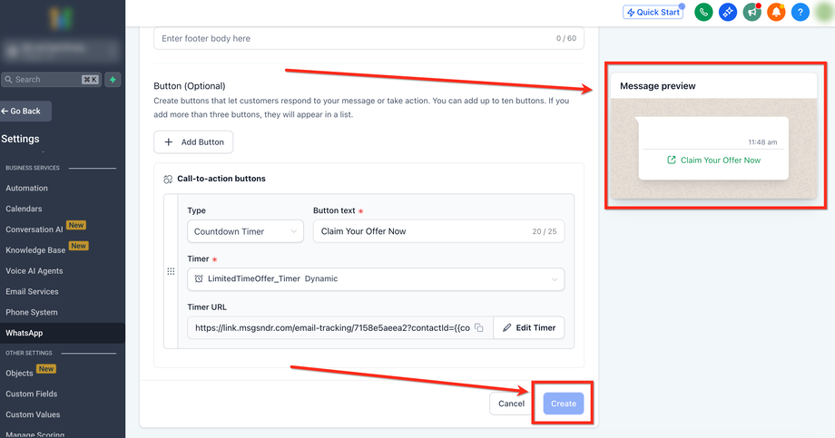 Klicke auf Create, um die WhatsApp-Vorlage zu finalisieren
