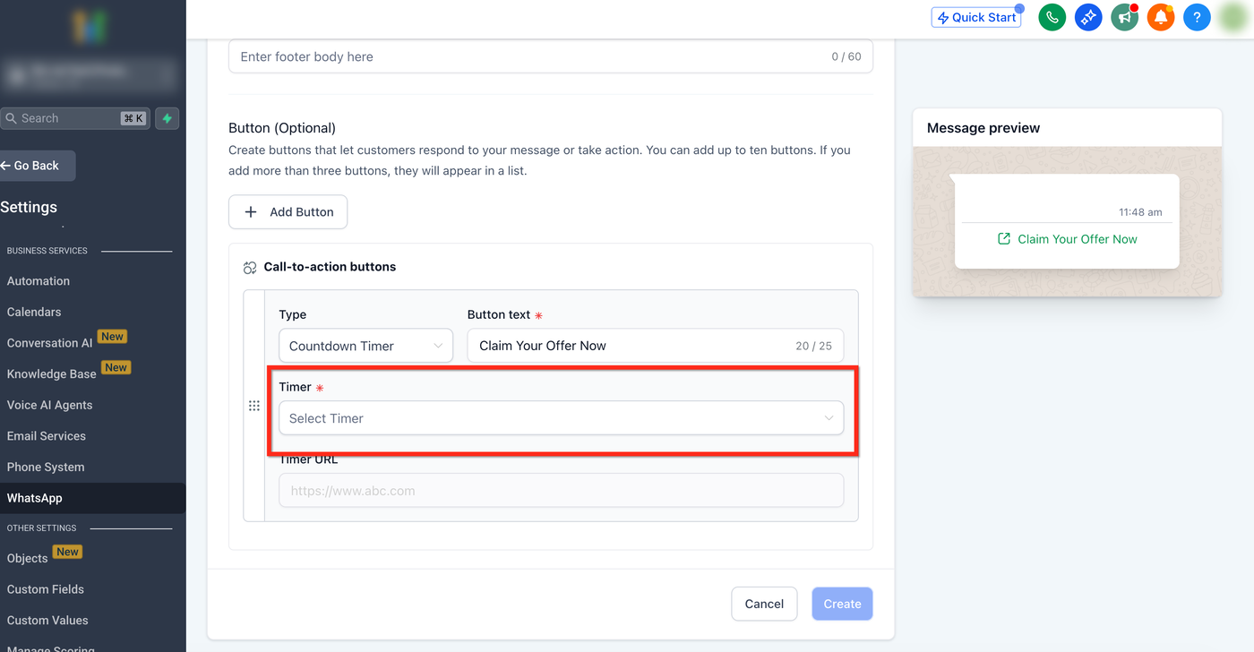 Countdown-Timer in WhatsApp-Nachrichten ermöglichen es dir, dieselben HighLevel-Timer, die du bereits in E-Mails, Funnels und Websites verwendest, innerhalb eines WhatsApp-Template-Buttons einzusetzen.