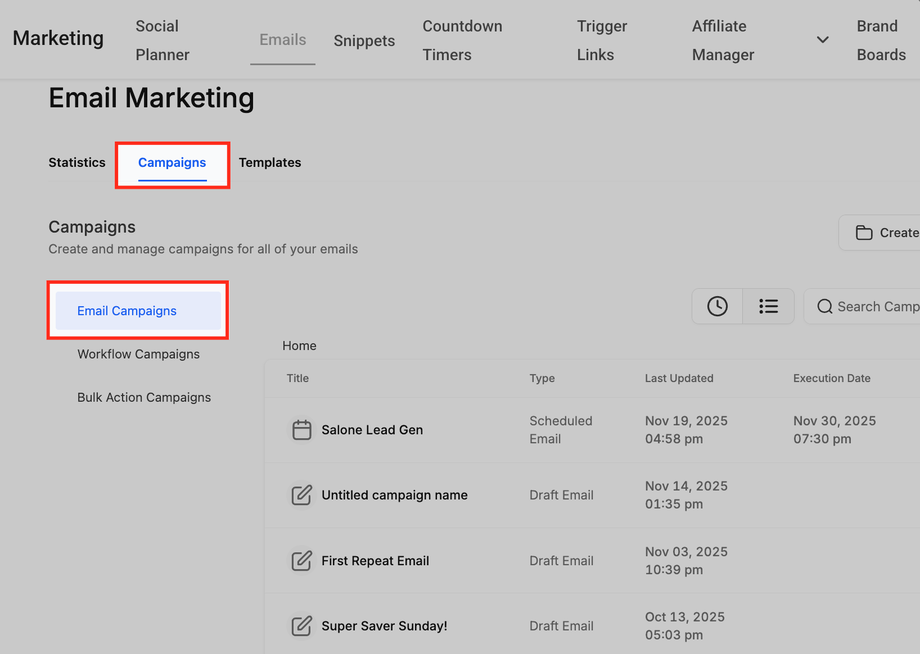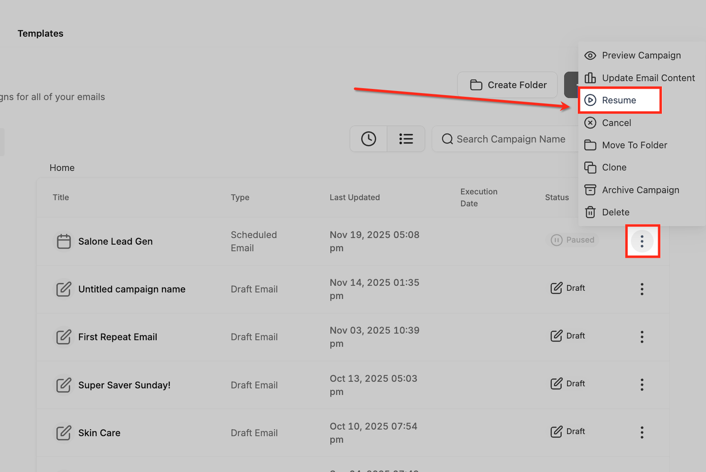 Verwalten Sie Ihre geplanten E-Mail-Kampagnen in HighLevel ganz einfach, indem Sie sie direkt über die Seite „E-Mail-Kampagnen“ pausieren, fortsetzen oder stornieren. Diese Optionen geben Ihnen die volle Kontrolle über den Kampagnenversand und ermöglichen es Ihnen, kurzfristige Änderungen vorzunehmen, Fehler zu beheben oder den Versand vollständig zu stoppen, bevor die Kampagnen live gehen.