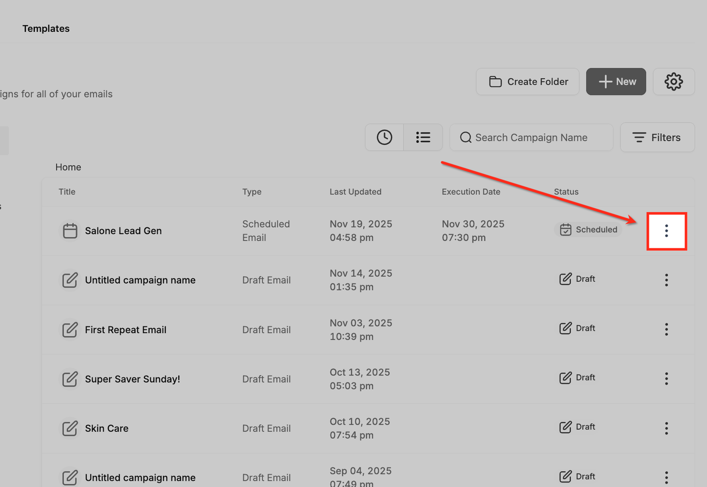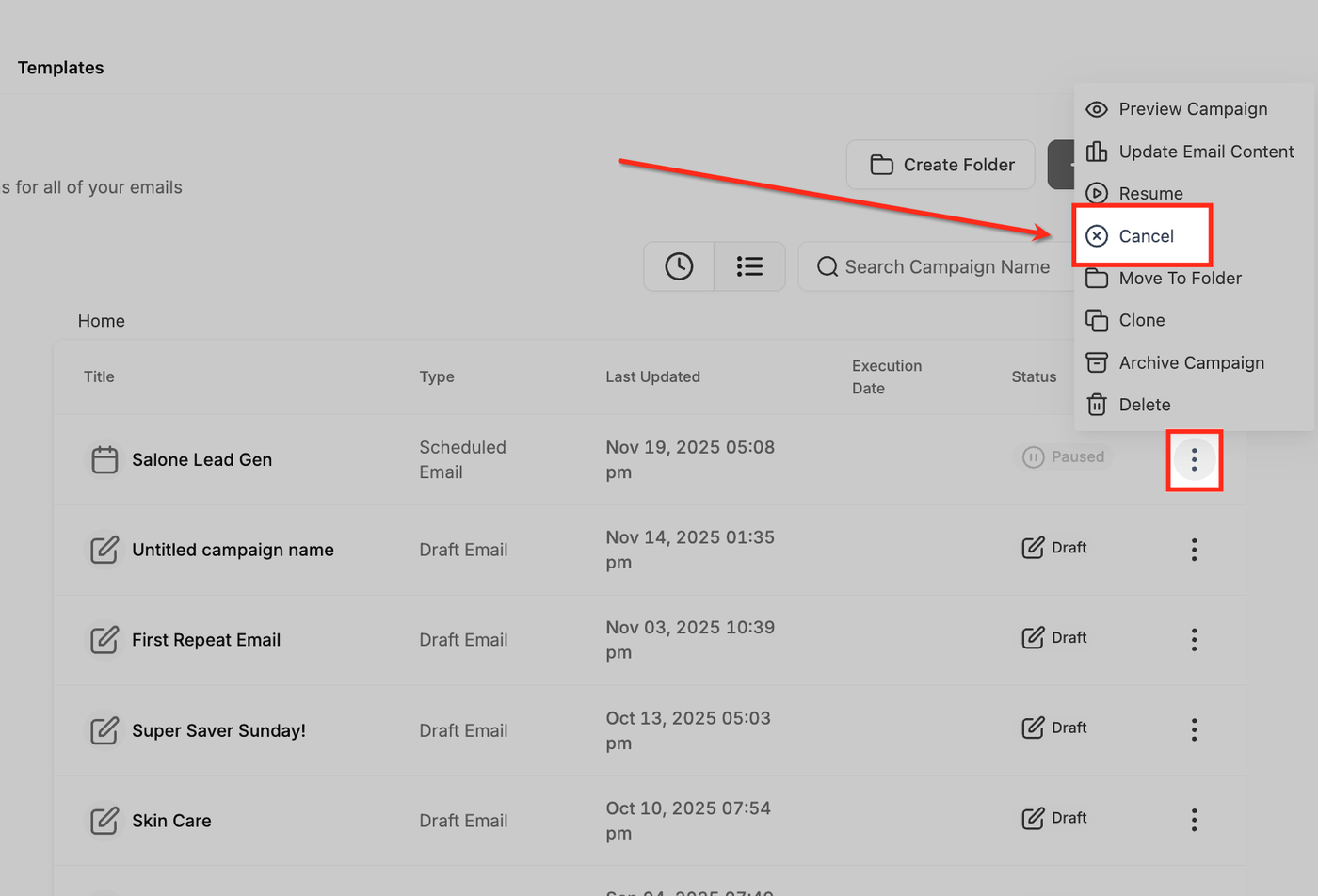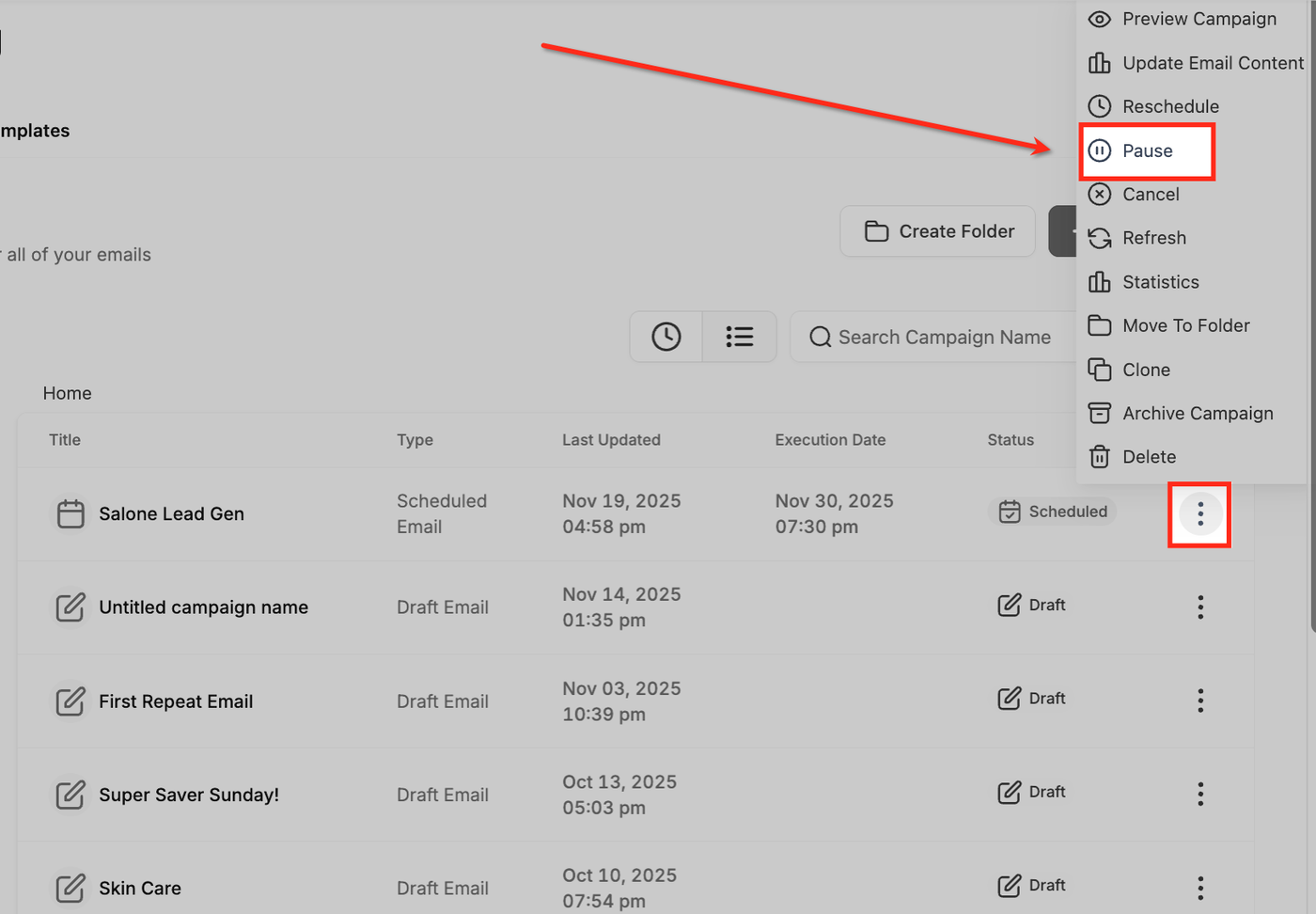 Diese Funktion ermöglicht es Ihnen, geplante E-Mail-Kampagnen zu kontrollieren, bevor sie versendet werden. Ganz gleich, ob Sie schnelle Bearbeitungen vornehmen, einen E-Mail-Versand verzögern oder eine Kampagne vollständig stoppen möchten – Sie können dies jetzt mühelos über das Aktionsmenü der Kampagne verwalten.