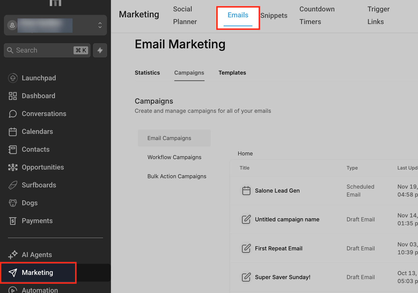 Gehen Sie in der linken Seitenleiste zu Marketing → E-Mails.