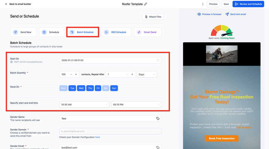 Batch-Planung (auch als Batch-Zustellung oder Drip-Modus bezeichnet) verteilt den Versand über definierte Intervalle. Anstatt an die gesamte Empfängerliste gleichzeitig zu senden, können Sie Batch-Größe, Timing und aktive Tage festlegen, sodass die Zustellung allmählich und vorhersehbar erfolgt.