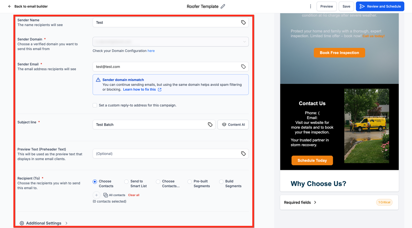 Absendername, Absenderdomain und Absender-E-Mail eingeben