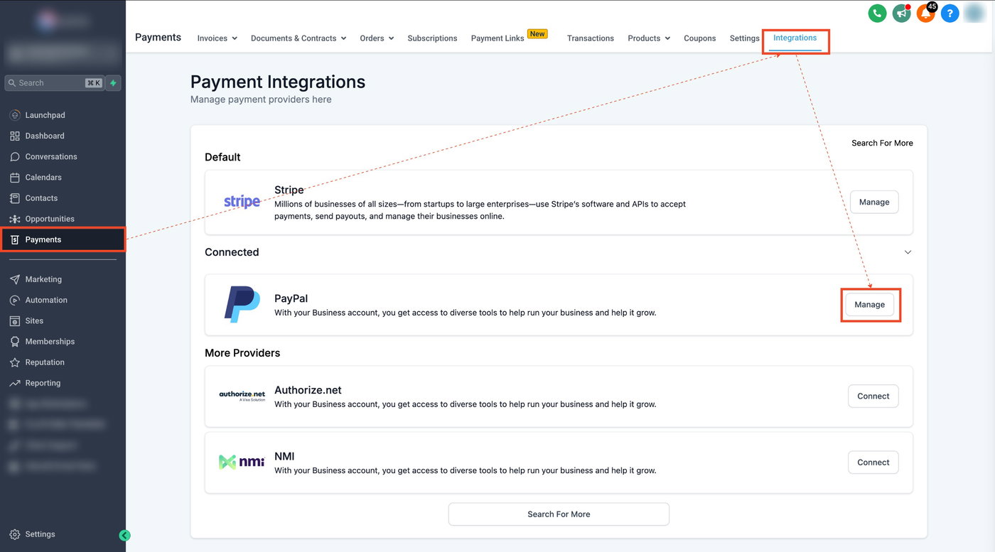 Scrollen Sie nach unten zu PayPal und klicken Sie auf Manage.