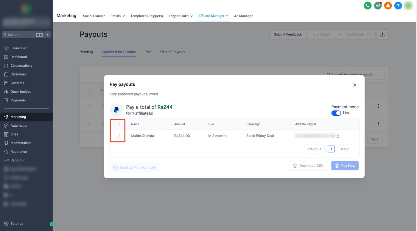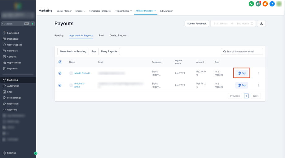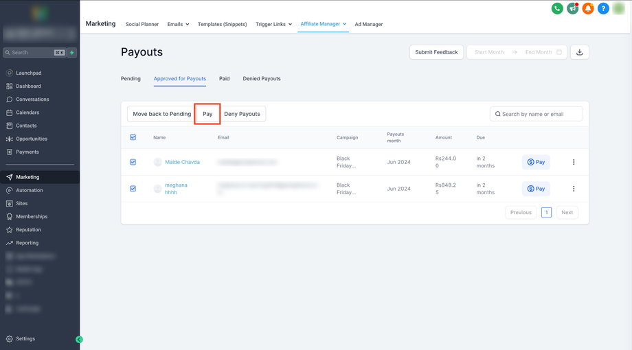 Sobald die Affiliates ausgewählt sind, klicken Sie auf Pay, um mehrere Affiliates gemeinsam auszuzahlen.