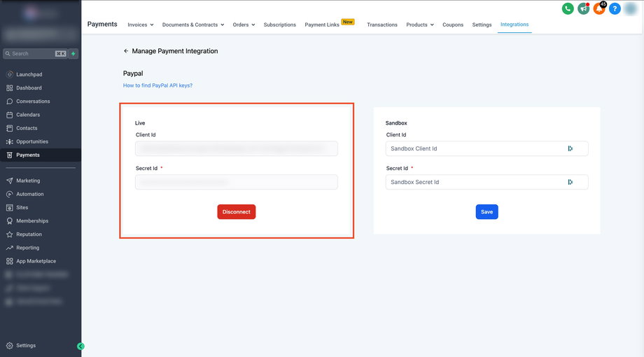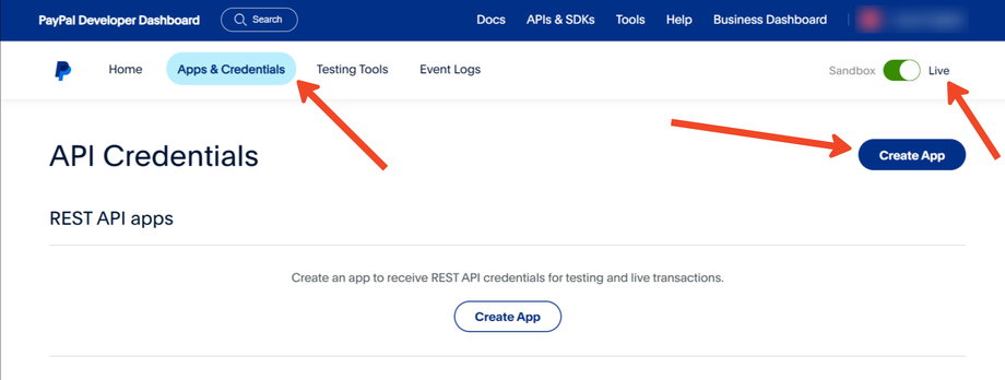 Wenn Sie im Sandbox-Modus testen, wiederholen Sie den Vorgang mit den Sandbox-Zugangsdaten und stellen Sie sicher, dass auf der Seite Apps and Credentials in PayPal „Sandbox“ ausgewählt ist.