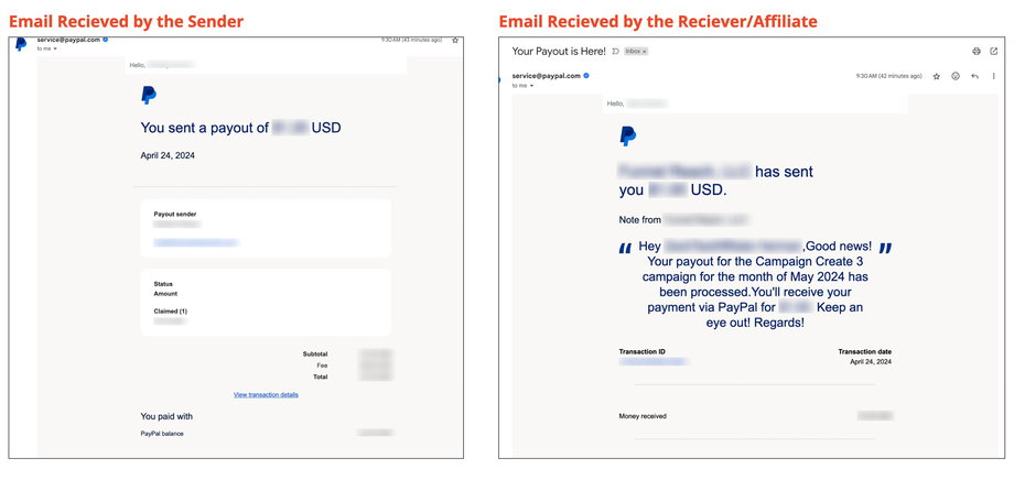 Nach einer erfolgreichen Auszahlung erhalten sowohl der Admin (Absender) als auch der Affiliate (Empfänger) eine Bestätigungs-E-Mail.
