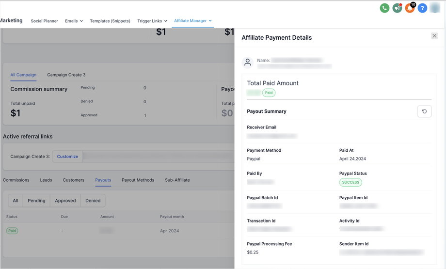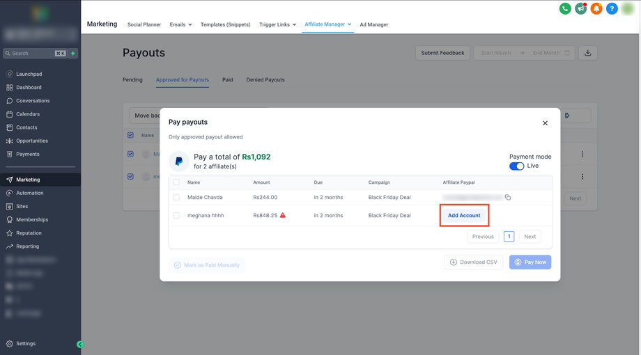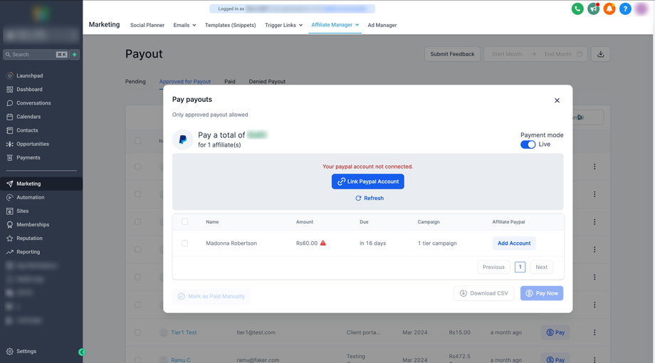 Bevor Sie Affiliates auszahlen, stellen Sie sicher, dass deren PayPal-Daten verknüpft sind. Um zu erfahren, wie Sie das PayPal-Konto eines Affiliates hinzufügen oder verknüpfen, klicken Sie hier.