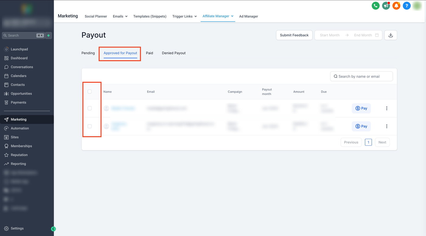 Aktivieren Sie das Kontrollkästchen neben den Payouts oder den Namen der Affiliates, die Sie auszahlen möchten.
