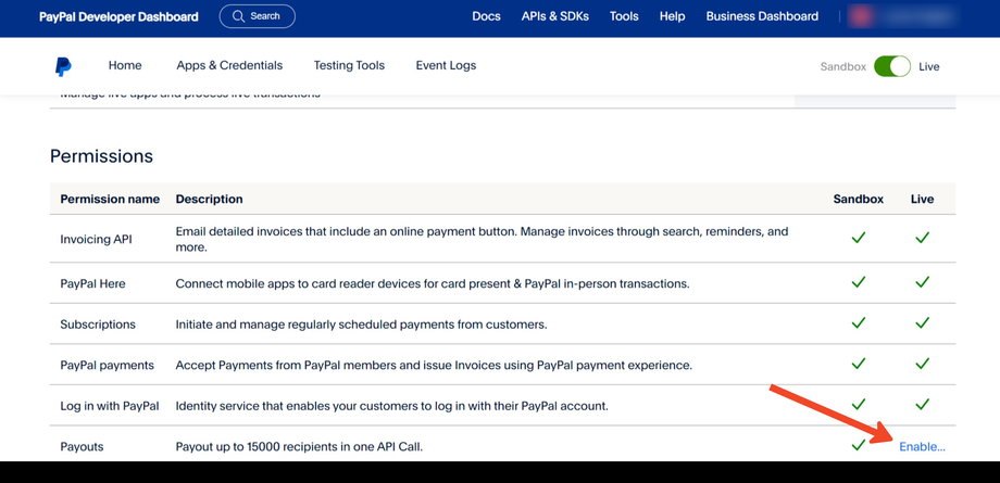 Falls nicht, klicken Sie auf Enable und folgen Sie den Anweisungen. Möglicherweise müssen Sie PayPal kontaktieren, um die Payouts API aktivieren zu lassen.