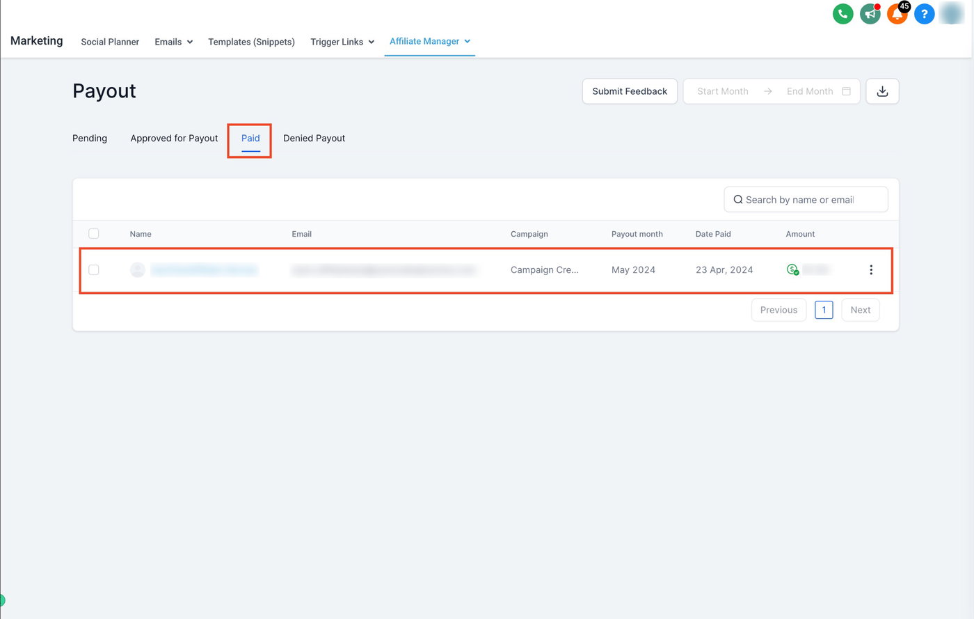 Alternativ können Sie auf das blaue Pay-Symbol neben dem Namen eines Affiliates klicken, um ihn einzeln auszuzahlen.