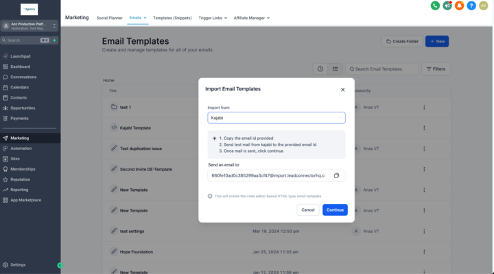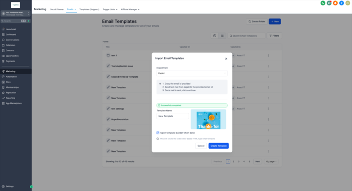 Benutzer können Vorlagen nahtlos aus Kajabi importieren, indem sie diese einfach per E-Mail aus Kajabi an unsere dynamisch generierte E-Mail-Adresse senden – in nur wenigen Schritten.