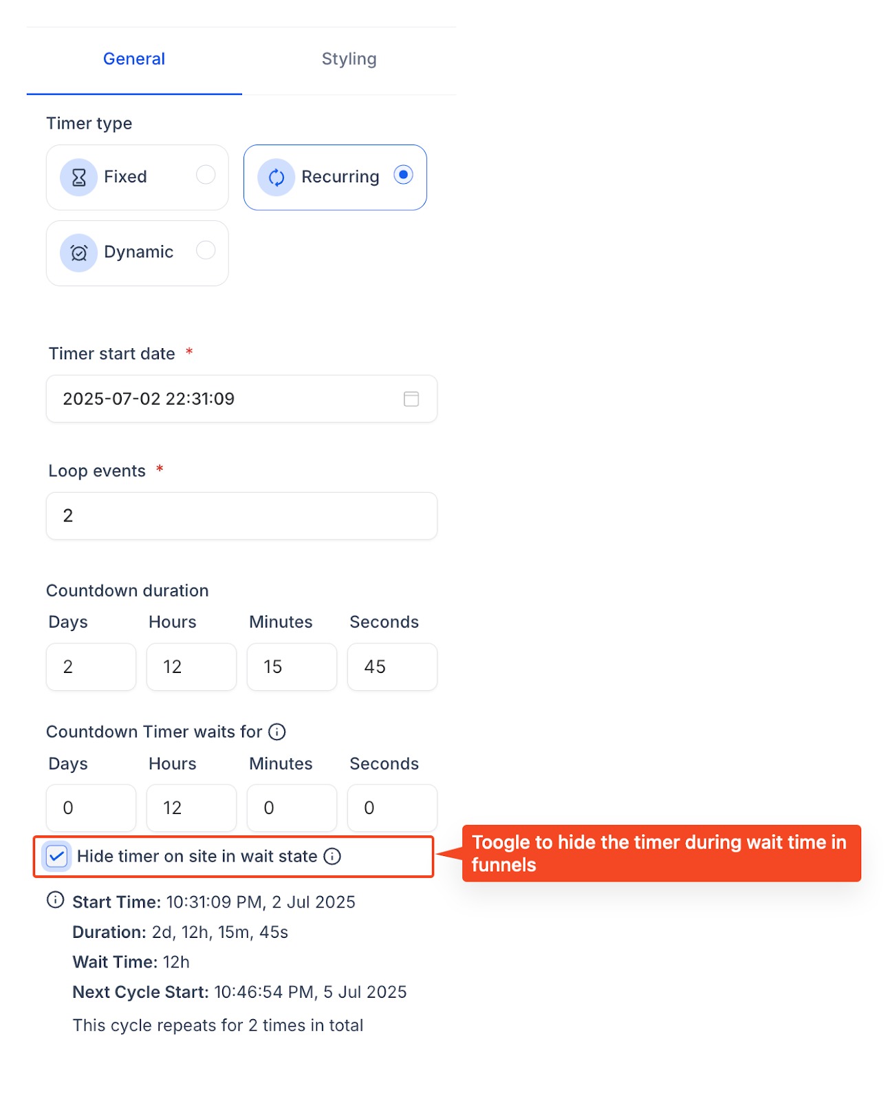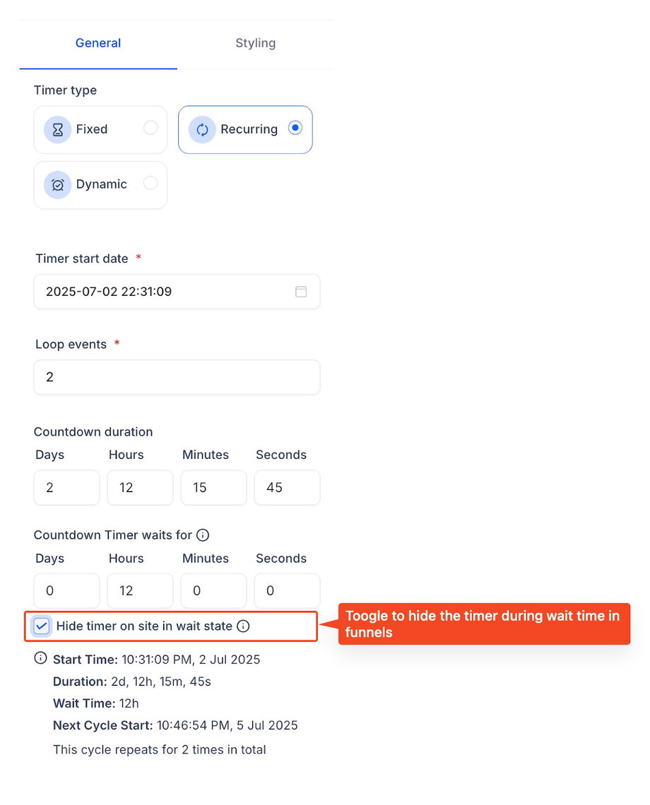 Die Option „Hide Timer“ betrifft nur Funnels