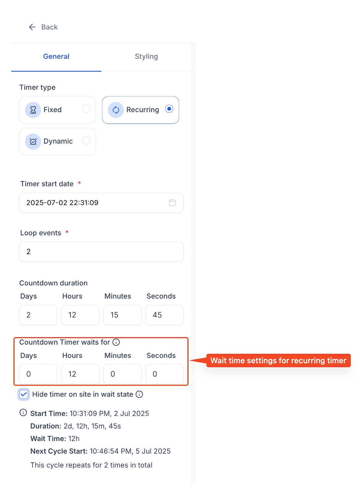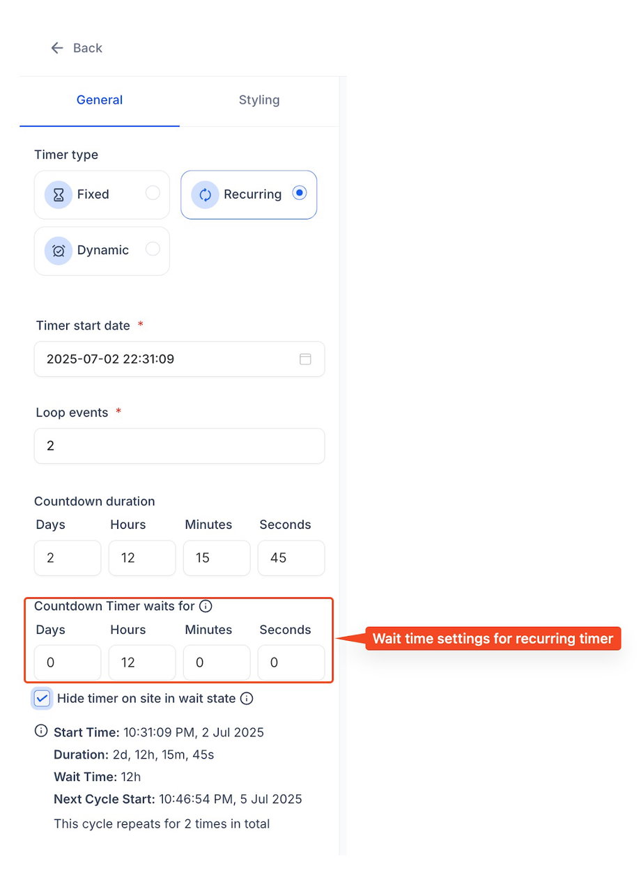 Die Wartezeit ist nur für den Timer-Typ „Recurring“ verfügbar.