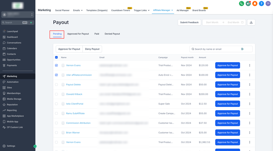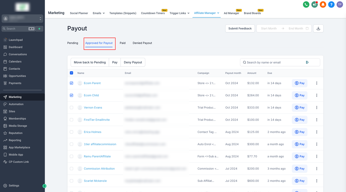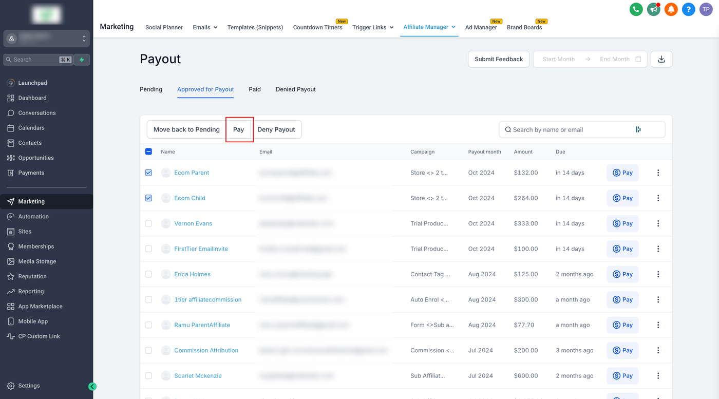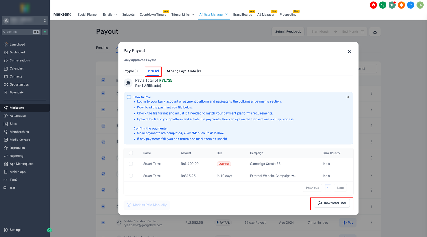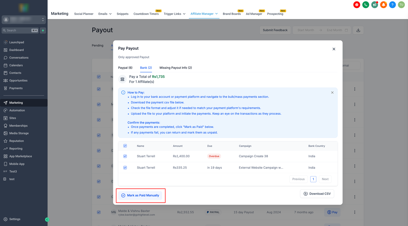 Nutze Banken oder andere Methoden, um Affiliates manuell zu bezahlen, und markiere die Auszahlungen anschließend als „bezahlt“ in GHL.