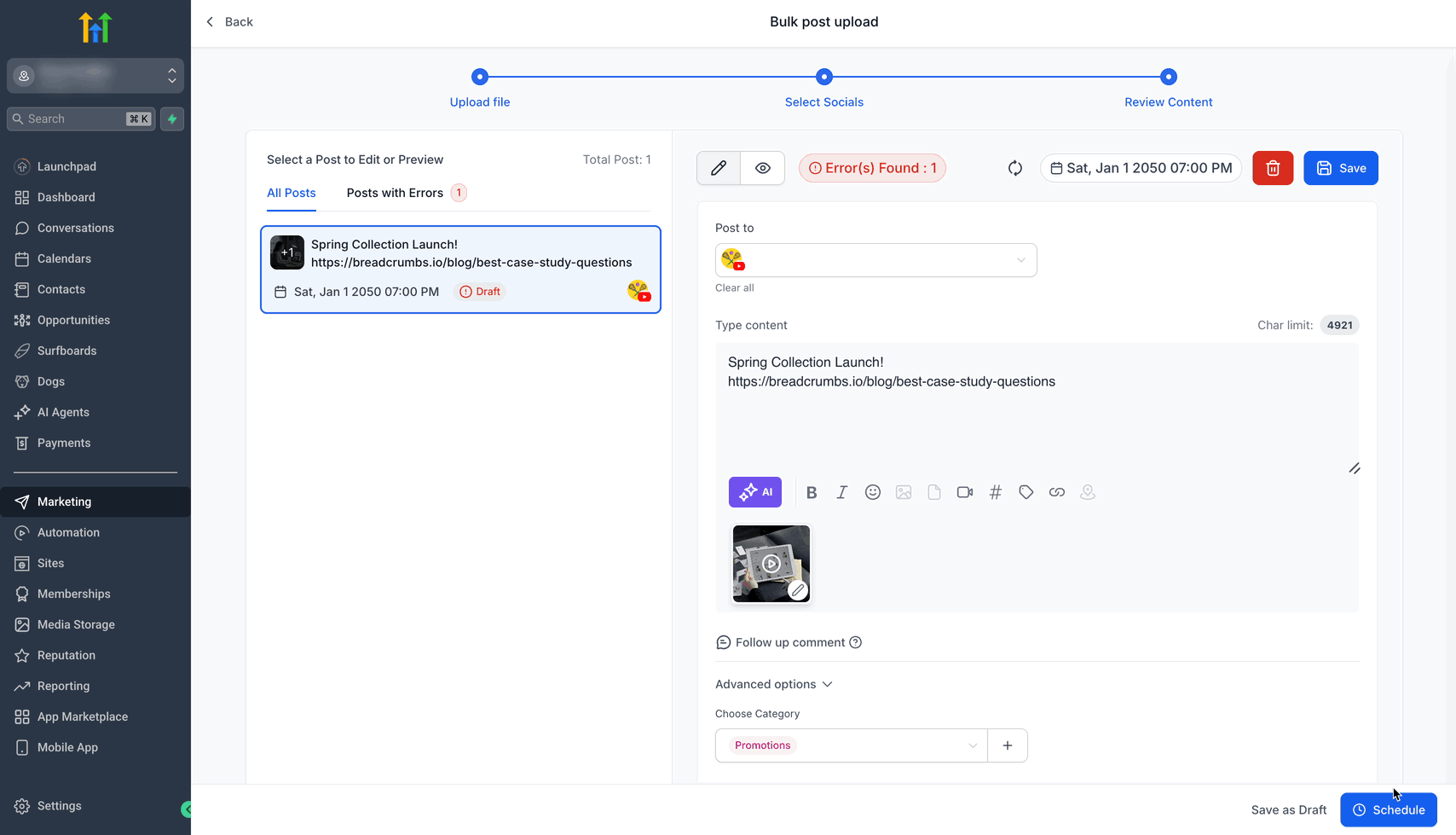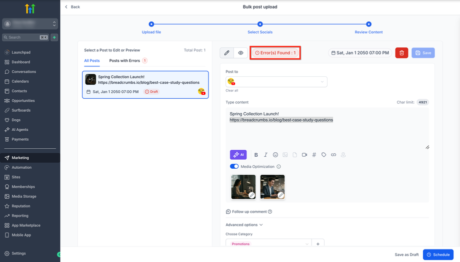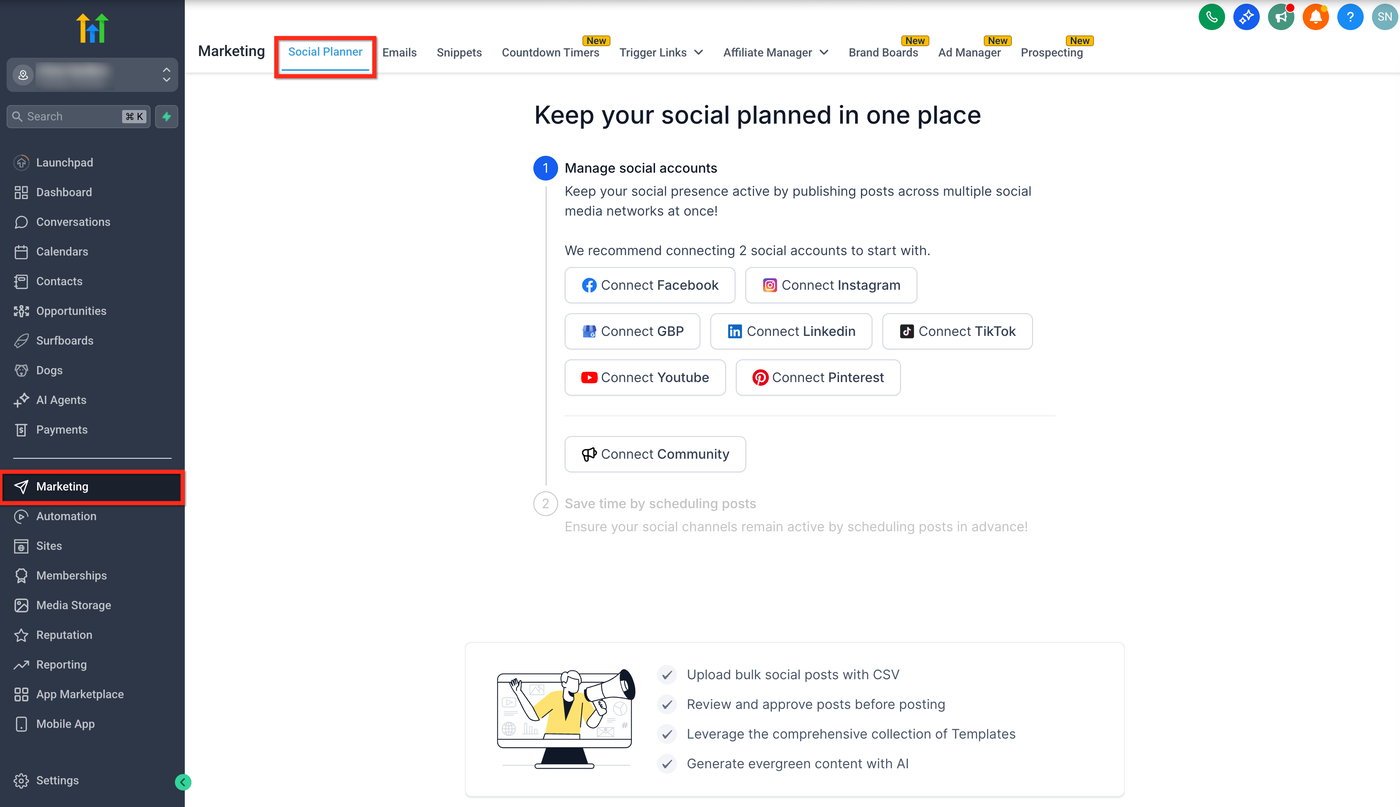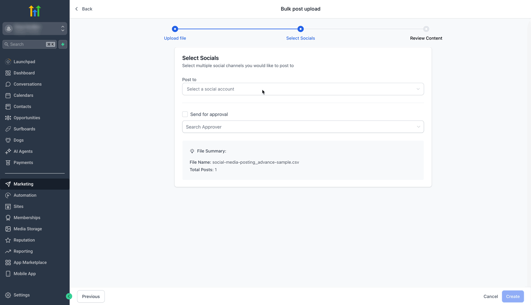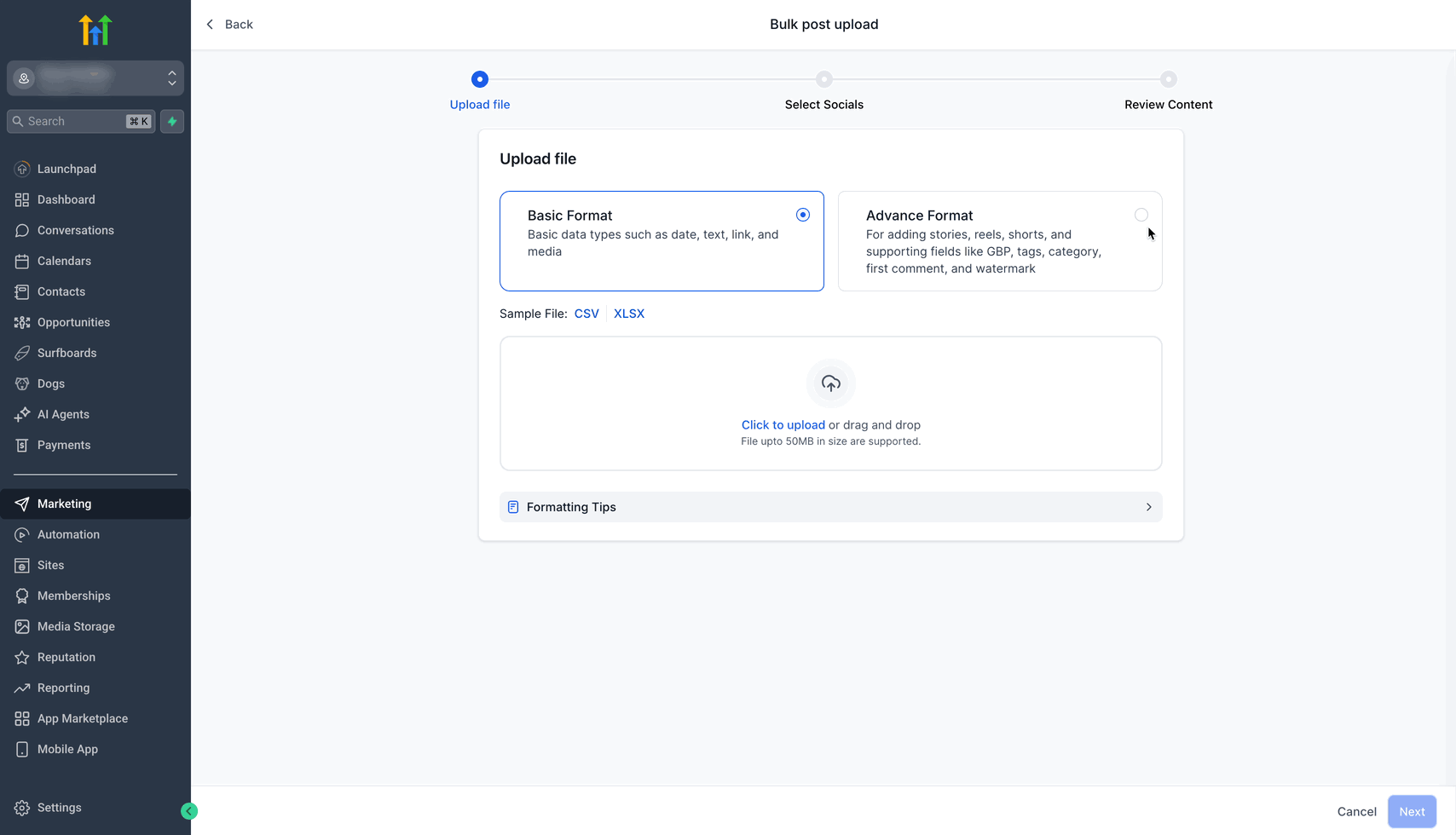 Verwalte und plane große Mengen an Social-Media-Inhalten über mehrere Plattformen hinweg mühelos mit der Erweiterten CSV für Massenplanung von HighLevel.
