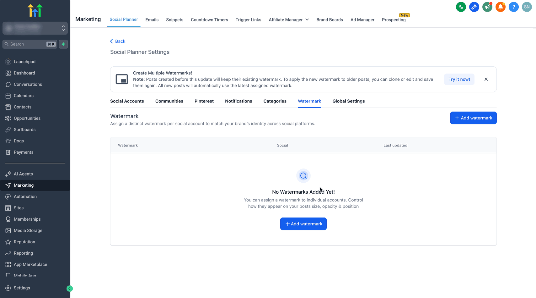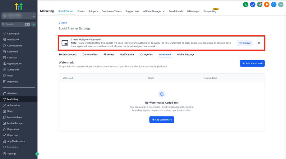 Wenn du noch kein Wasserzeichen hinzugefügt hast, siehst du einen Hinweis „Try It Now“, der dich dazu auffordert, eines zu erstellen. Wenn bereits ein einzelnes Wasserzeichen zugewiesen war, erscheint dieses automatisch in der Listenansicht als „All Socials“. Du kannst diese Konfiguration später bearbeiten und spezifische Wasserzeichen einzelnen Accounts zuweisen.