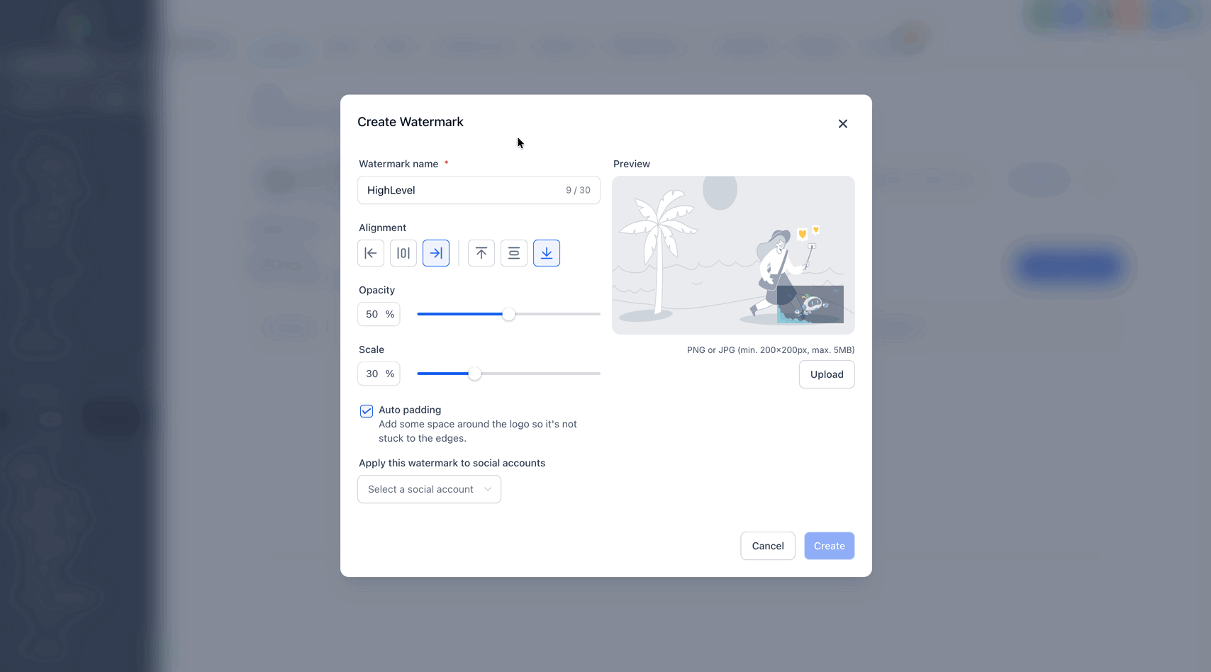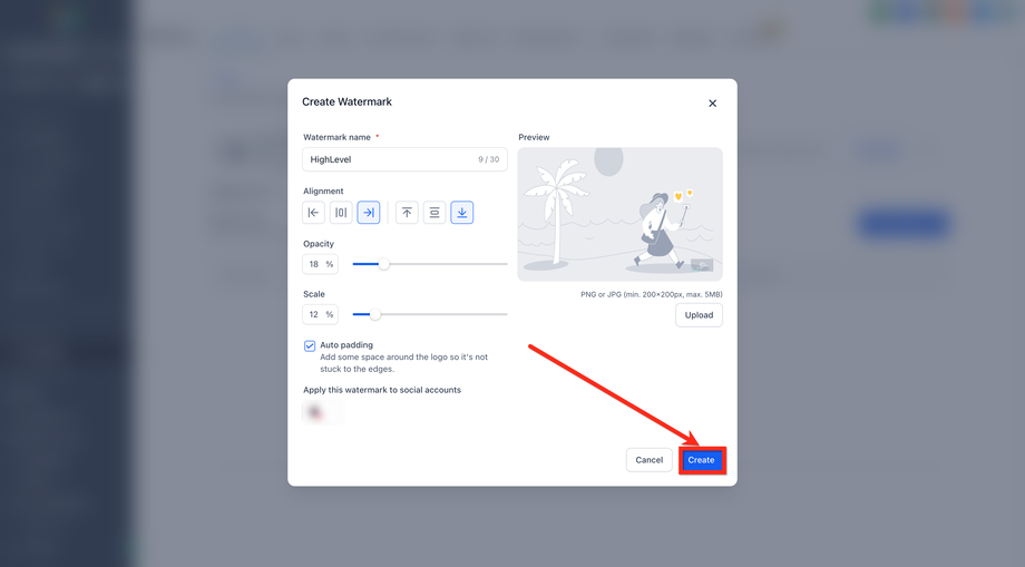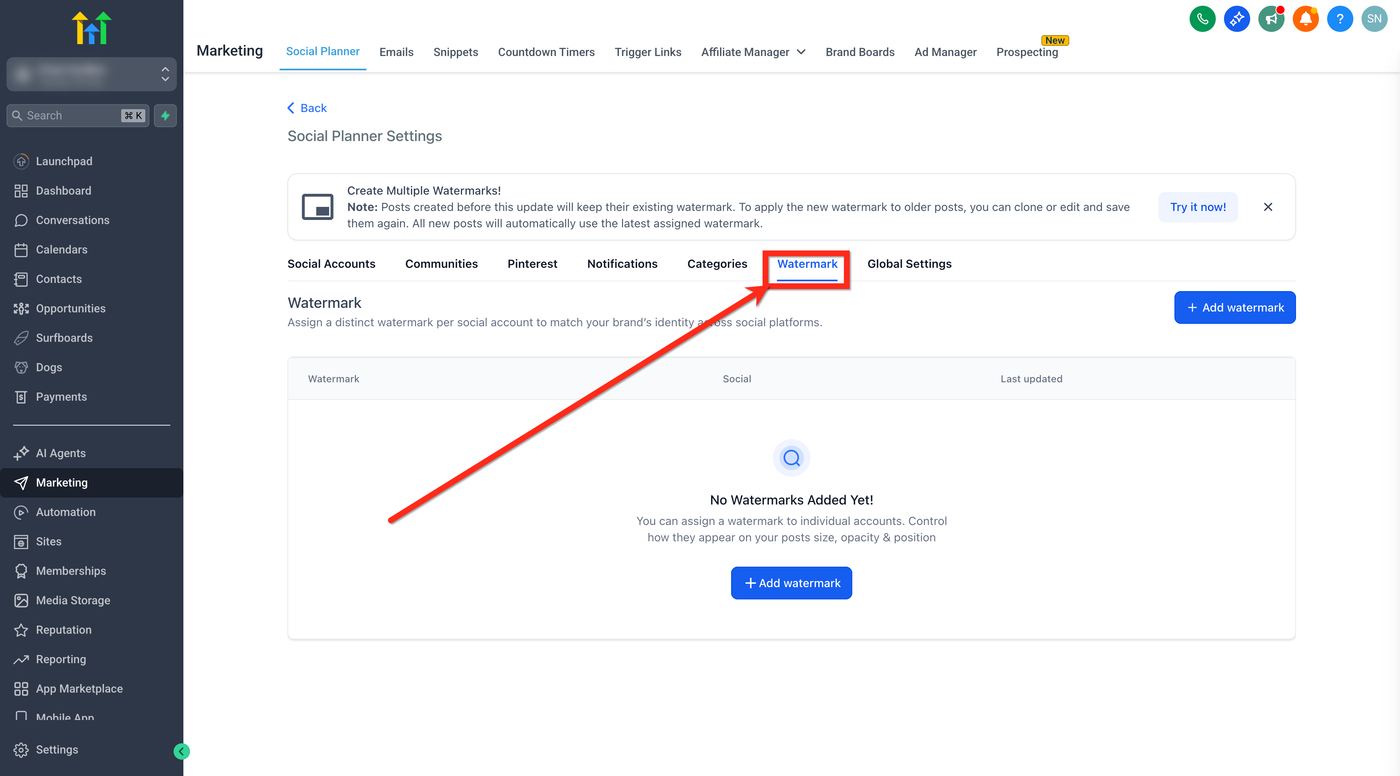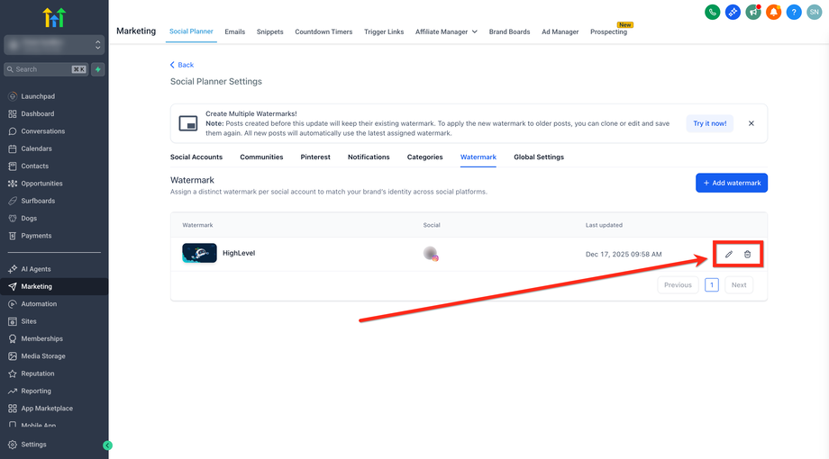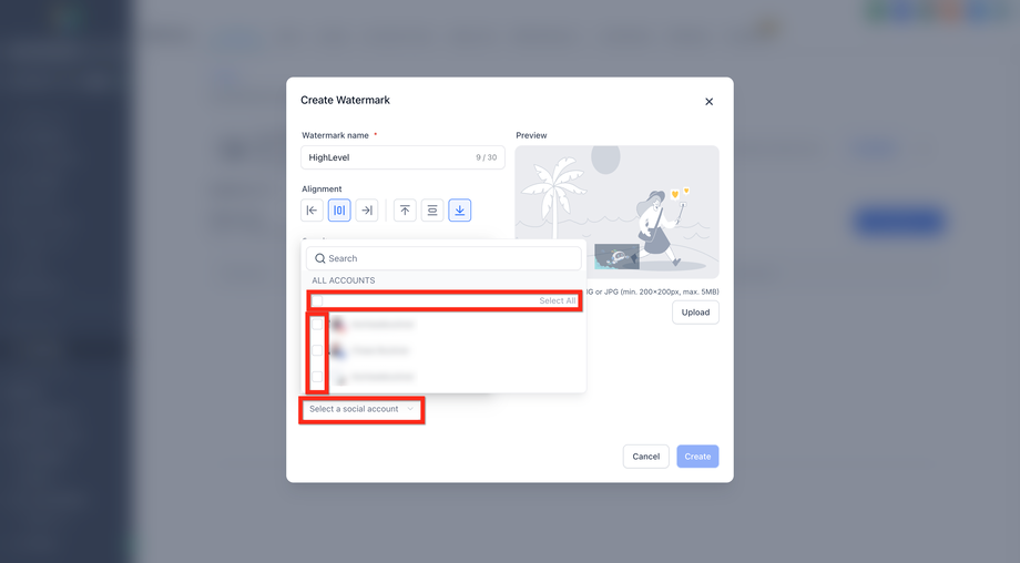 Ein Wasserzeichen ist ein sichtbares, oft halbtransparentes Design oder ein Text, der über ein digitales Bild oder Dokument gelegt wird. HighLevel ermöglicht es Nutzern, pro verbundenem Social-Media-Account ein Wasserzeichen hochzuladen und festzulegen, welches Wasserzeichen beim Veröffentlichen automatisch angewendet wird. Anstelle eines einzigen globalen Wasserzeichens bestimmen die Zuweisungen, welches Branding für welchen Account verwendet wird. So können Teams mehrere Marken verwalten, ohne Wasserzeichen wiederholt neu hochladen zu müssen.