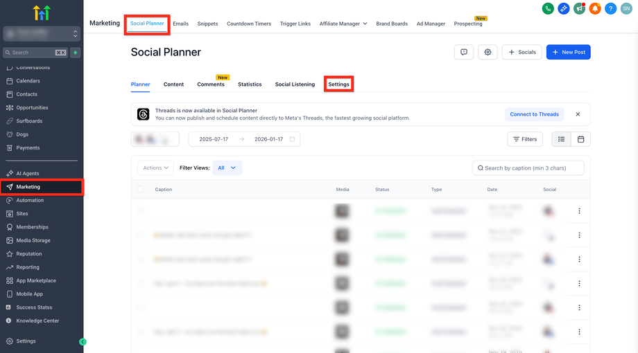 Navigiere zu Marketing → SocialPlanner → Einstellungen.