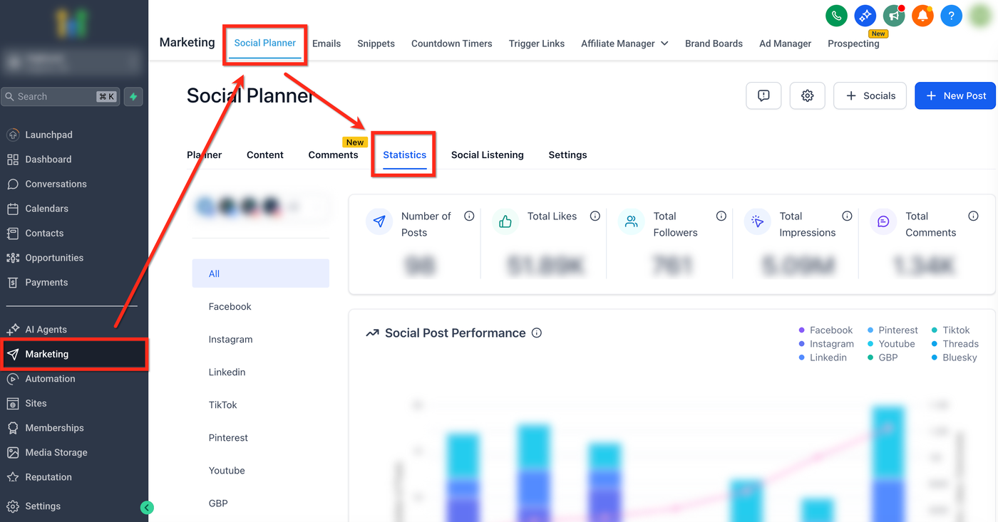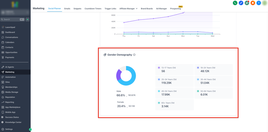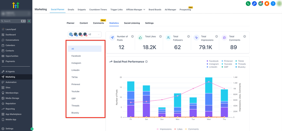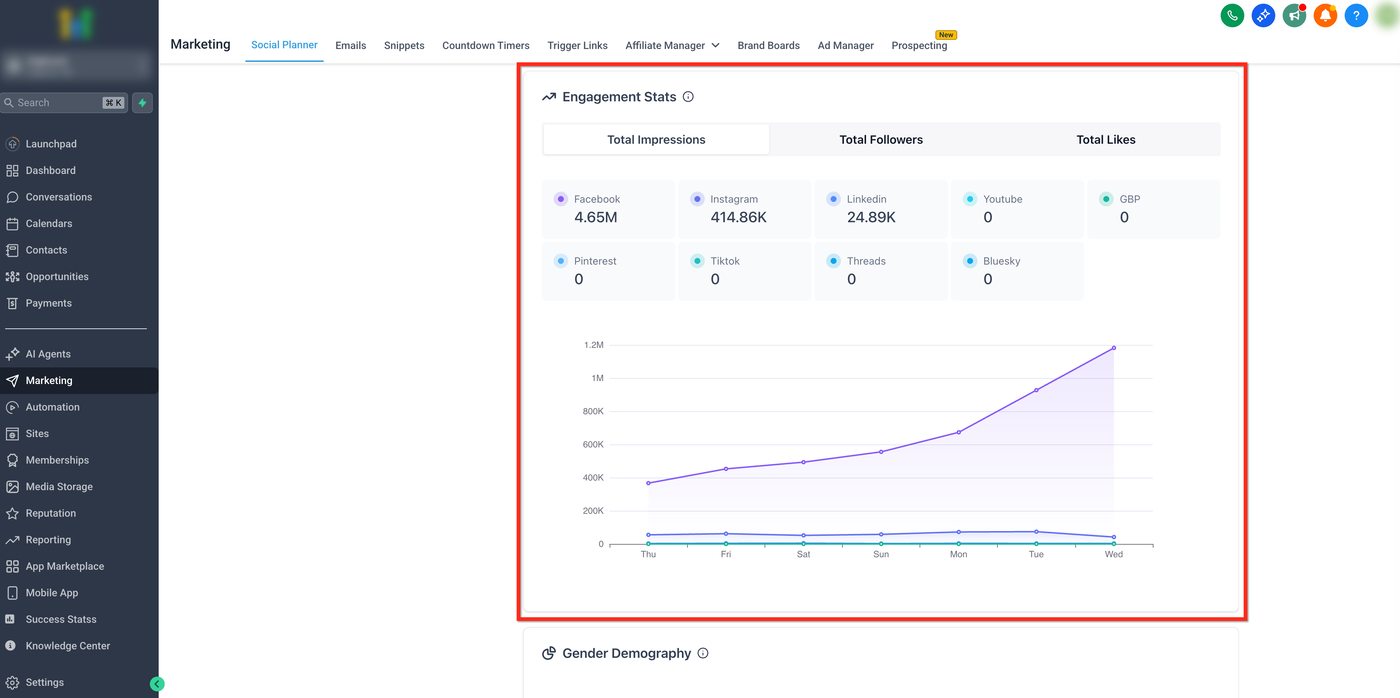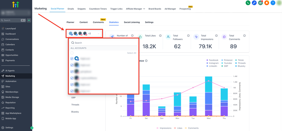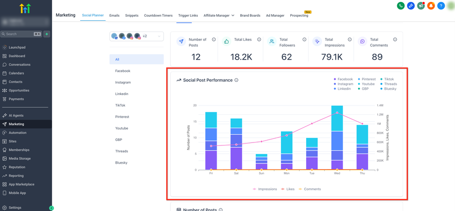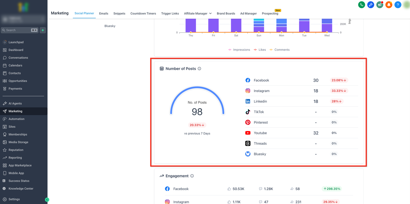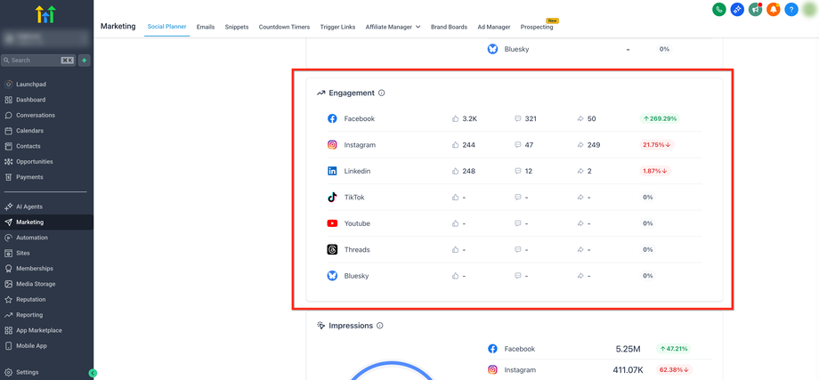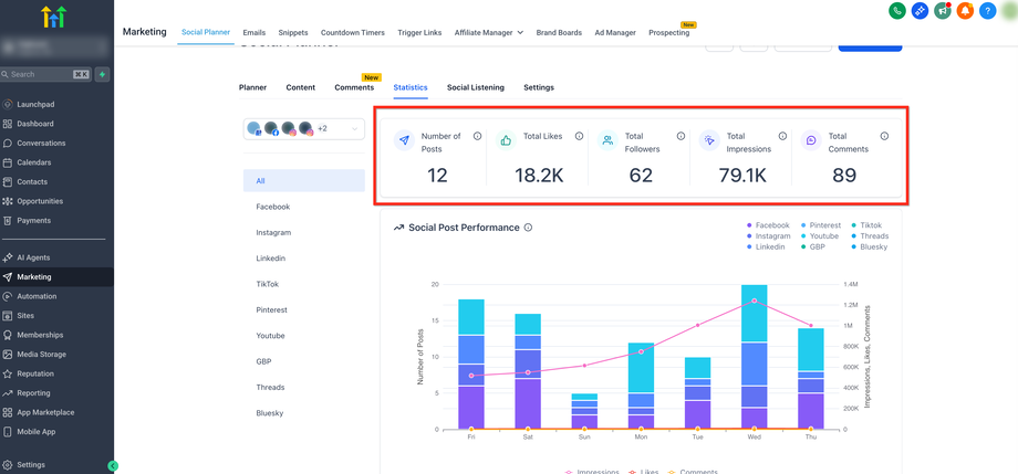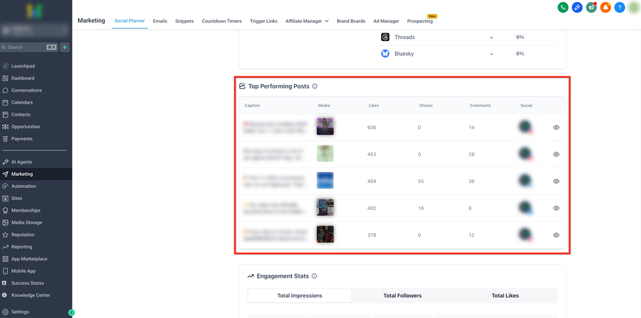 Die erweiterten Analysen im HighLevel Social Planner bieten eine konsolidierte Übersicht über die Social-Media-Performance deiner Konten, sodass du Posting-Volumen, Sichtbarkeit und Engagement auf einen Blick bewerten kannst. Nutze diese Einblicke, um zu erkennen, welche Inhalte am besten performen, Plattformen miteinander zu vergleichen und deine Strategie gezielt zu optimieren.