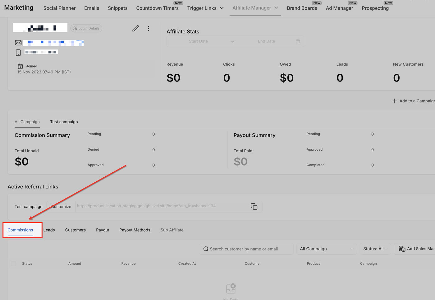 Wechsle im Affiliate-Profil zum Tab Commissions.