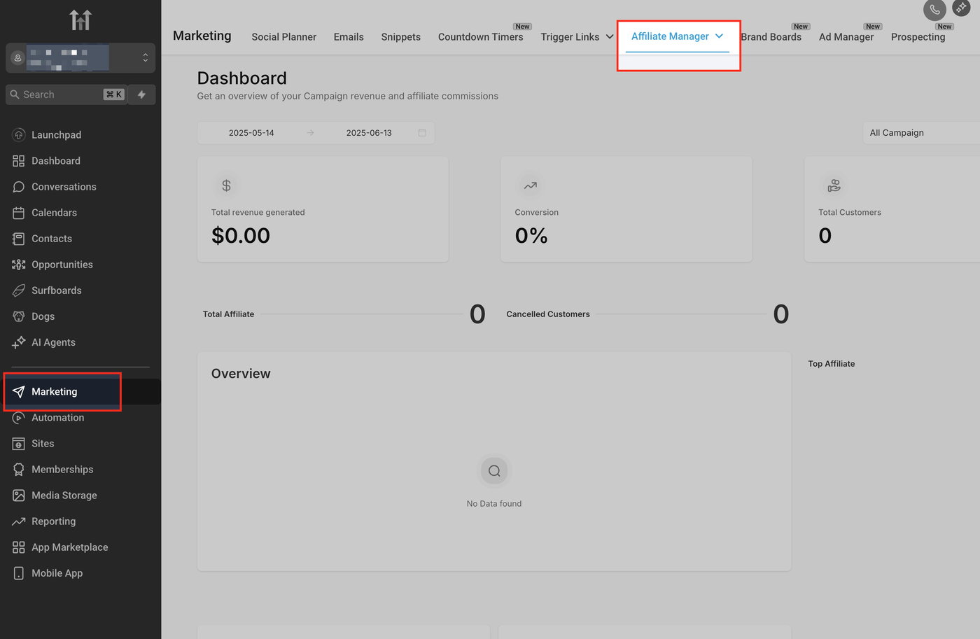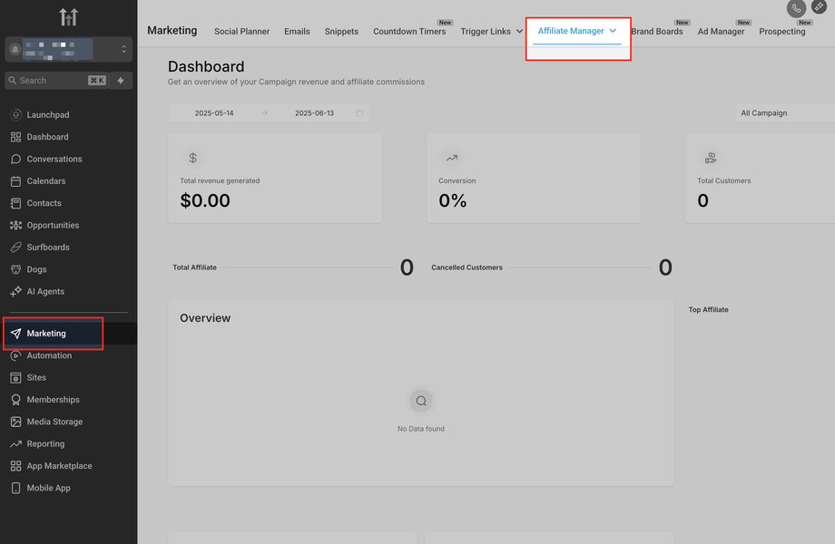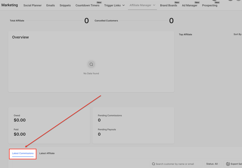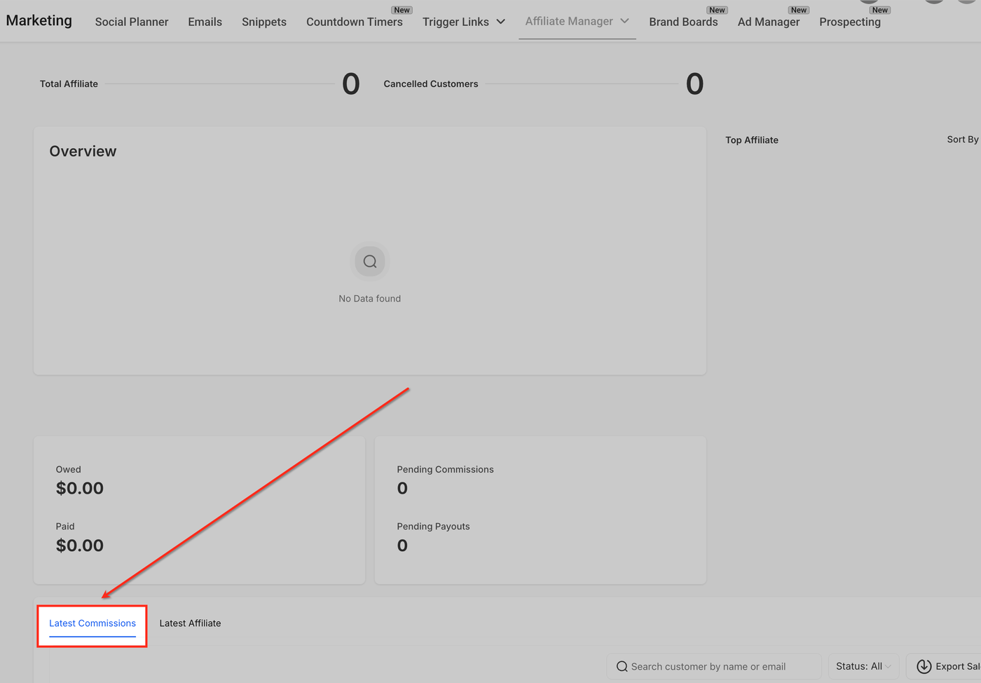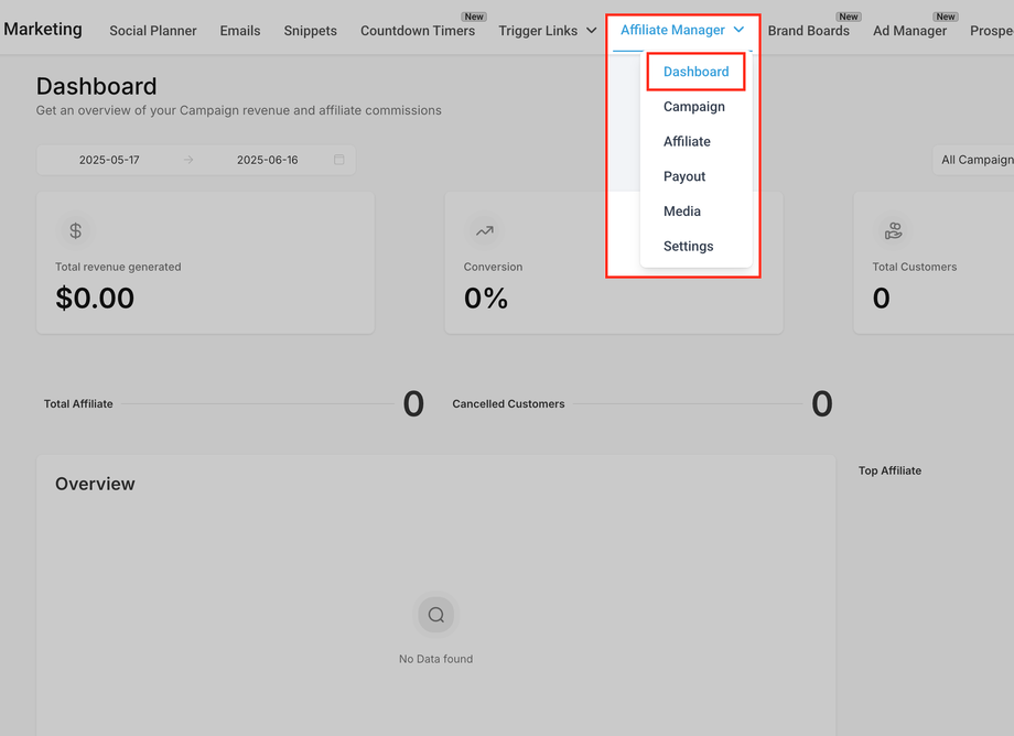 Gehe im Bereich Marketing zum Affiliate Manager.
