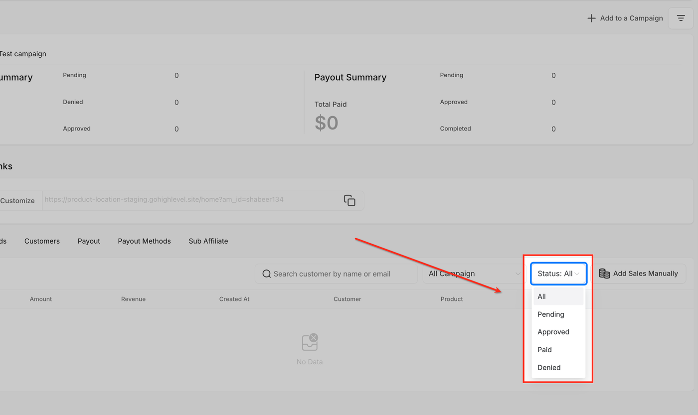 Provisionen nach Status (genehmigt, ausstehend, abgelehnt) oder Kampagne filtern