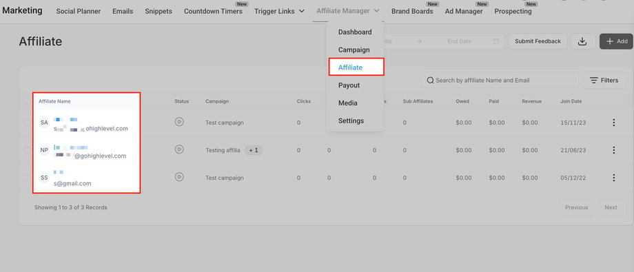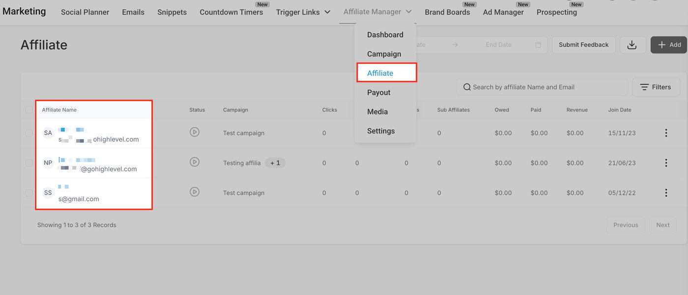 Wähle im Dropdown-Menü die Option Affiliate, um alle Affiliates anzuzeigen.