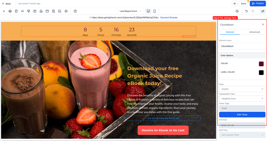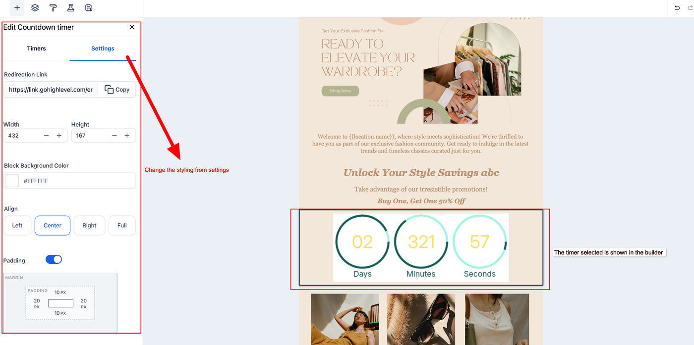 Positioniere und gestalte den Timer auf der Funnel-Seite so, dass er mit dem Timer in der E-Mail übereinstimmt.