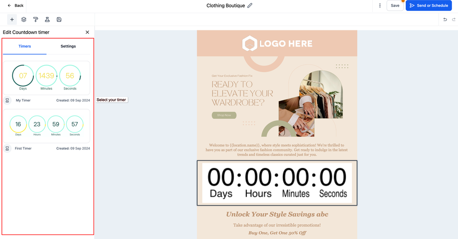 Erstelle eine E-Mail-Kampagne, füge das Countdown-Timer-Element ein und wähle deinen Timer aus.