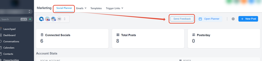 Gehe zum Tab „Marketing“ > „Social Planner“.