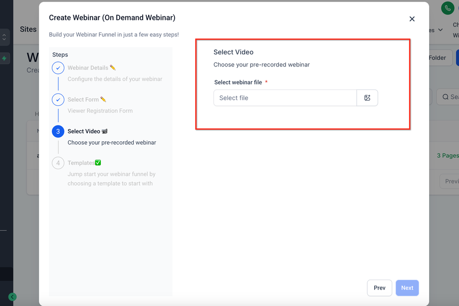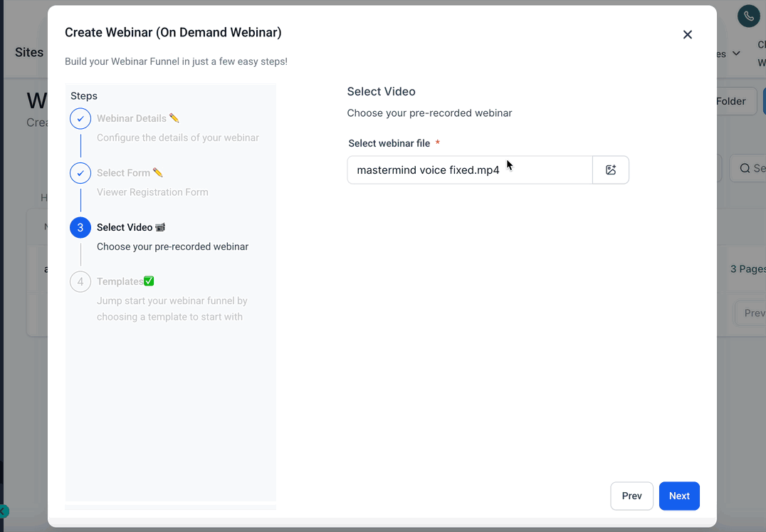 Video auswählen: Wähle dein vorab aufgezeichnetes Webinar aus.