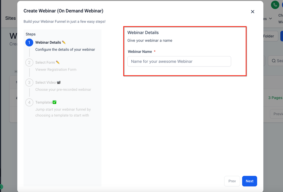 Webinar-Details eingeben: Gib deinem Webinar einen Namen.