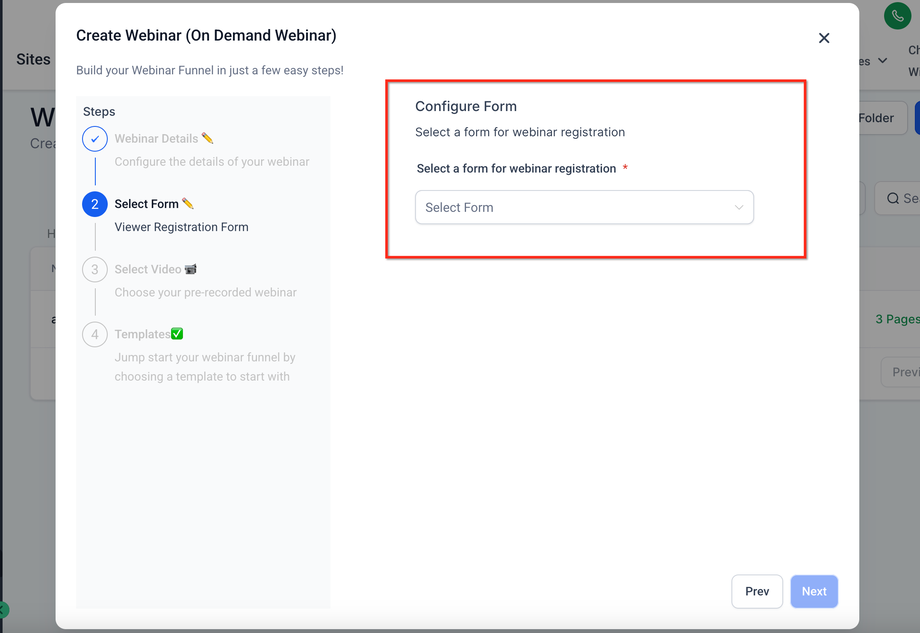 Formular auswählen: Wähle ein Formular für die Webinar-Registrierung.